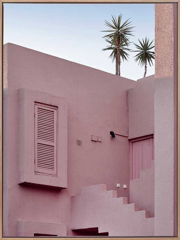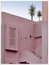 The Red Wall Poster Print. This clean brownish-red building with three lonely palm trees perched atop against a clear blue sky looks impressive in any space.