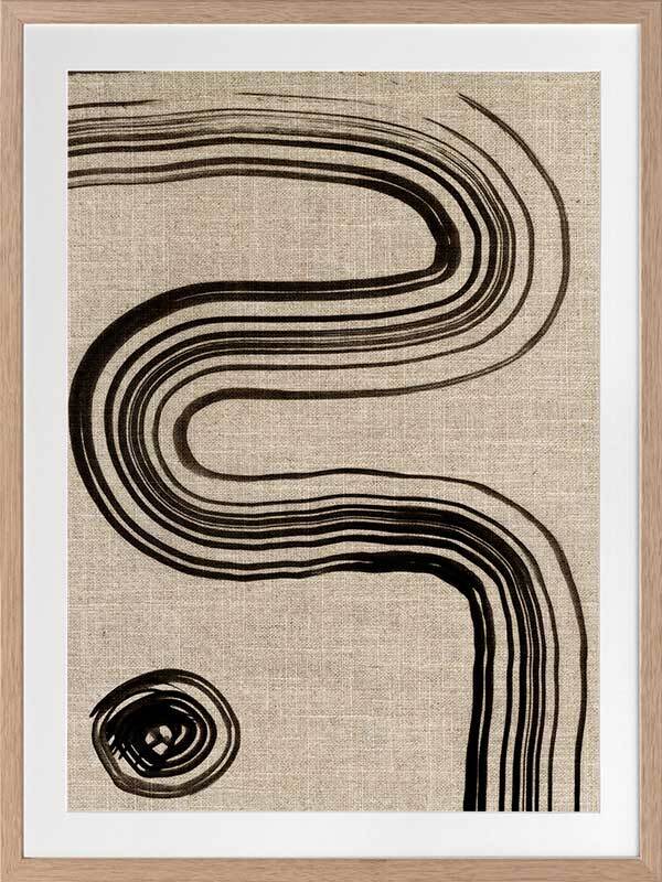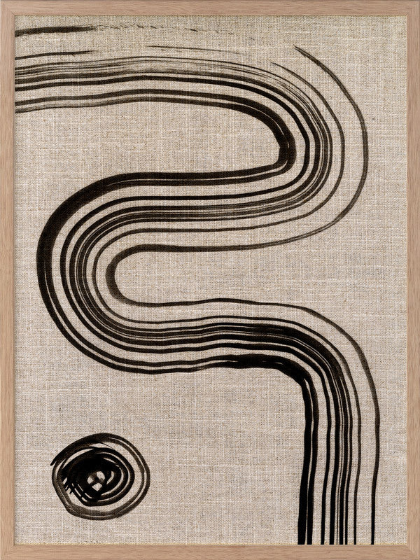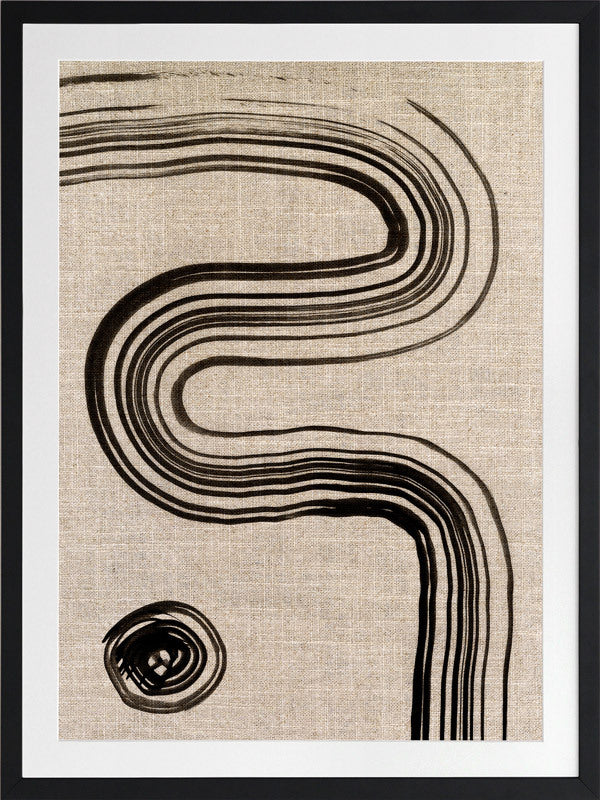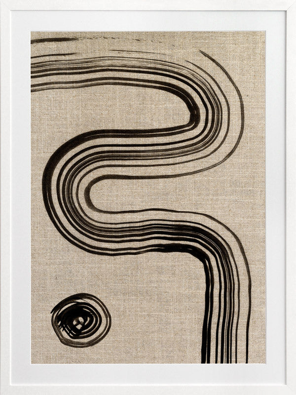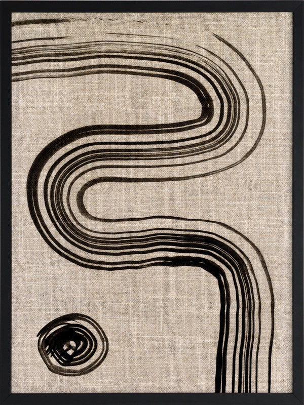 The Way Home II Framed Print: A tribal inspired abstract piece that features a linen look background with curved black lines. Pairs with The Way Home I and III. 2019 SPRING/SUMMER COLLECTION: SOLSTICE