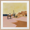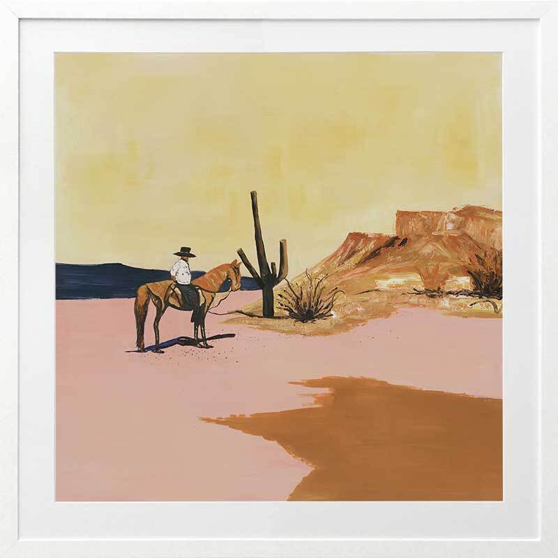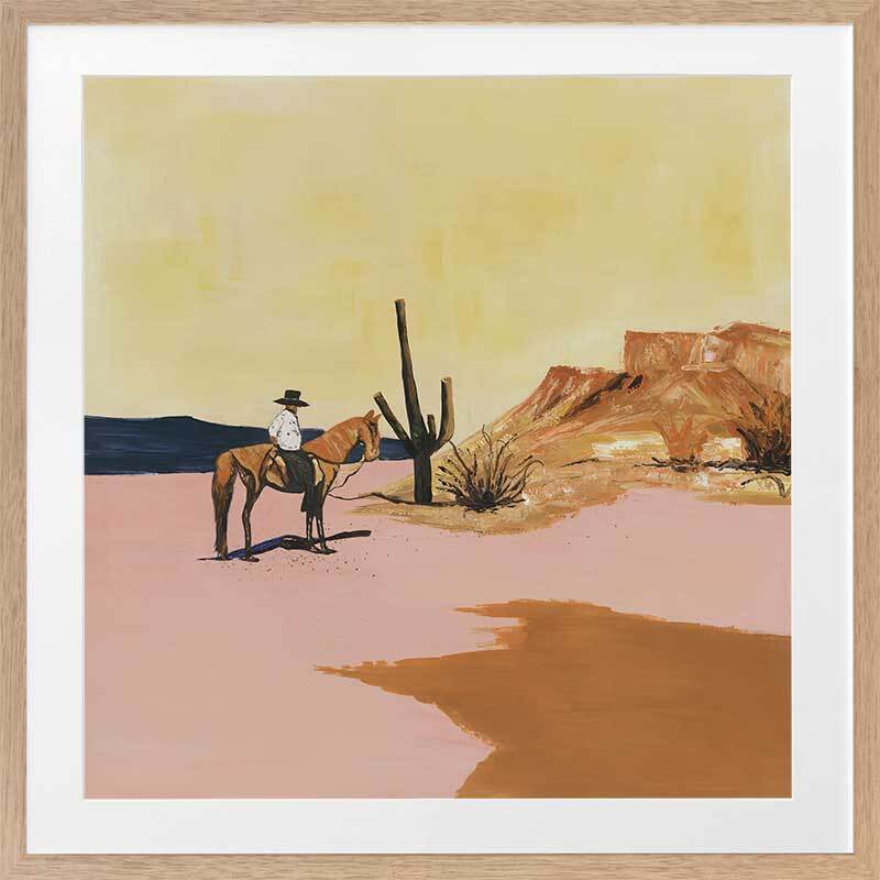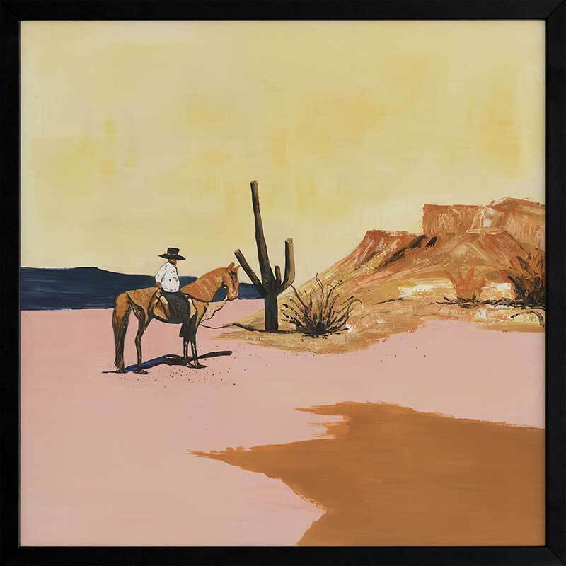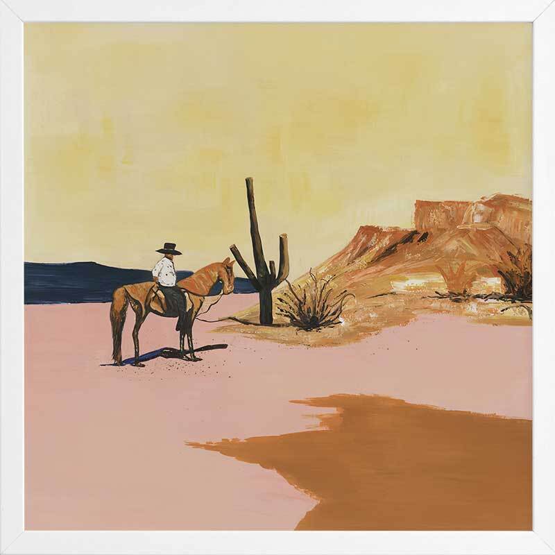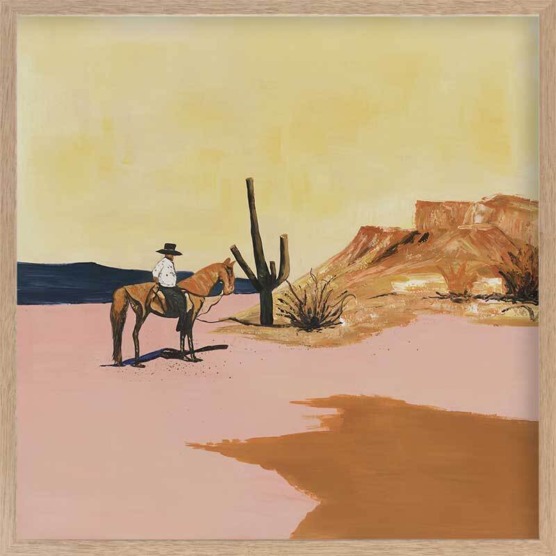 The Wild West Framed Art Print - Explore the untamed essence of your spirit through this captivating American Wild West-inspired artwork featuring a cowboy astride his horse amidst vast desert expanses, enveloped by towering cacti and the radiant embrace of the sun. The palette showcases inviting hues of mustard yellow, terracotta, sandy beige, and muted dusty pink.