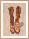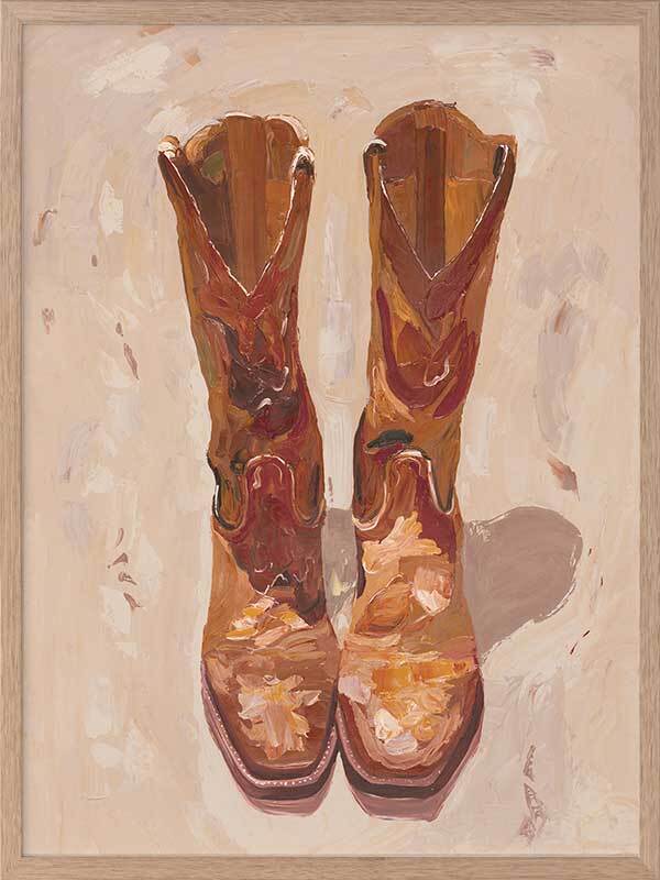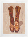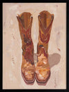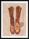 These Boots Were Made For Walking Framed Art Print - These cowboy boots were made for walking, and that's just what they'll do. This American Western-themed artwork pays homage to the iconic Lucchese boots, with an expressive, fluid style using visible, textured brush strokes. Palette is soft and relaxed using warm caramel, tan, and touches of burnt sienna.
