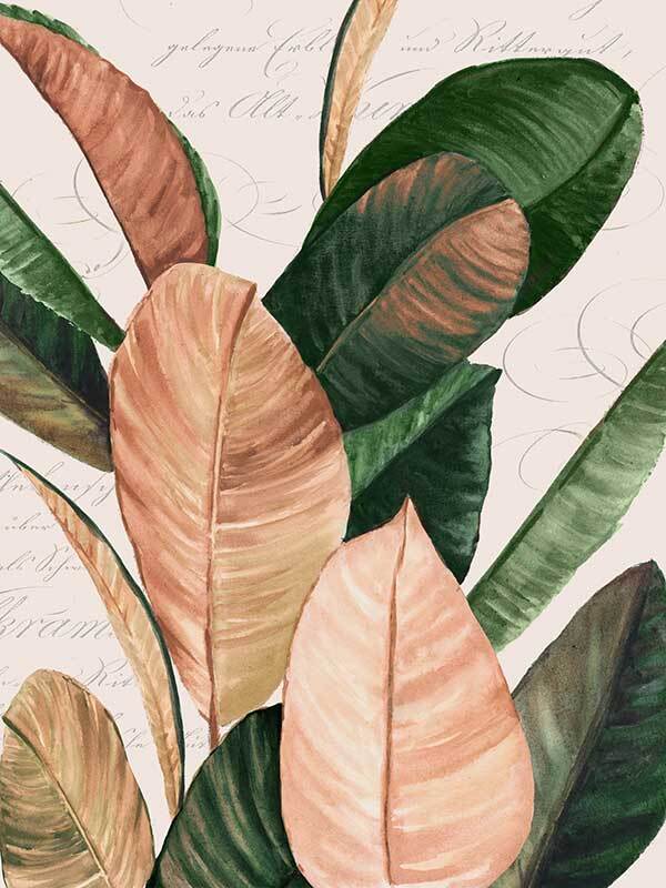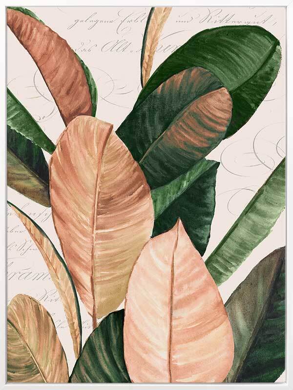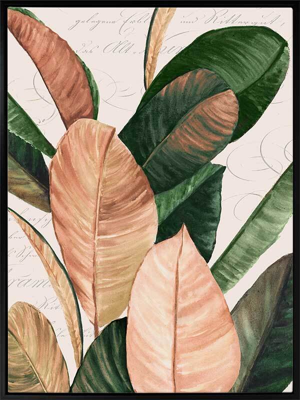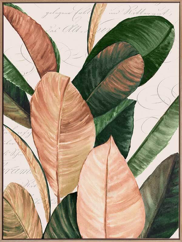 Thine II Canvas Art Print - An elegant still life of these giant leaves, this piece brings a nostalgic presence to your space with muted colours and the unique printed backdrop. Graceful cursive words float gently behind the jewel-toned green and honey pink leaves, all against a cream white background for that vintage feel.