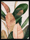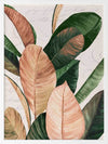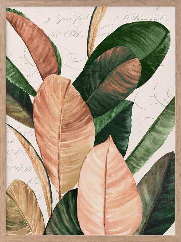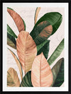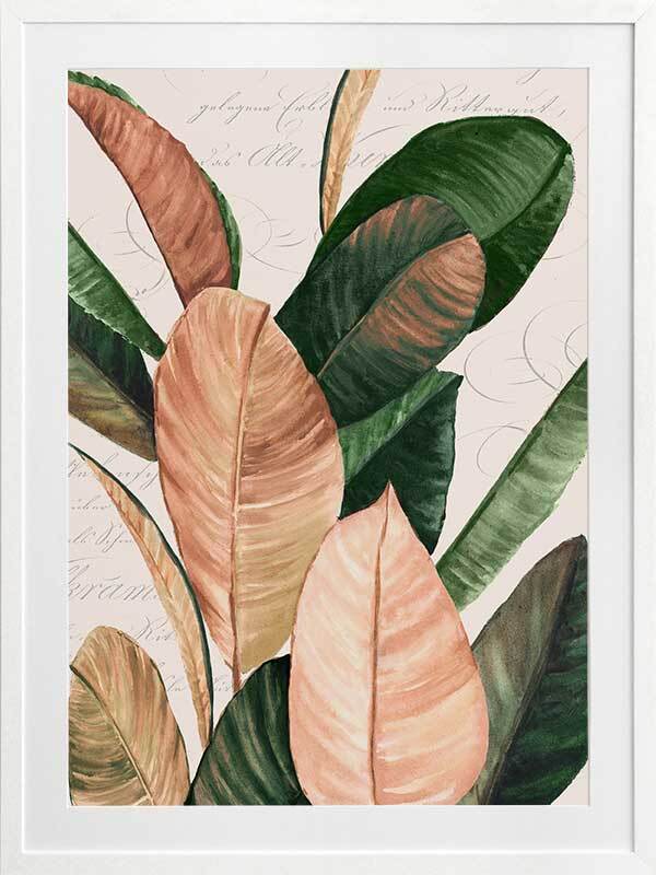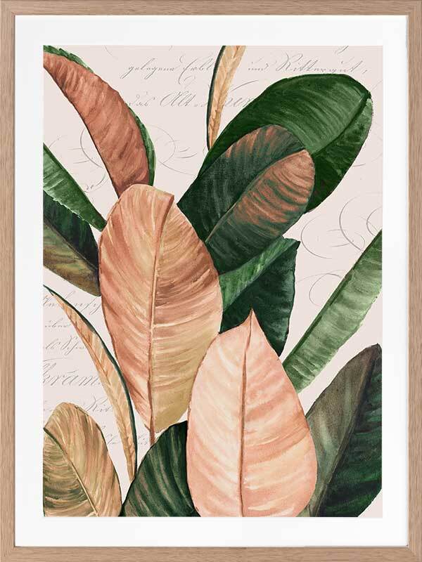 Thine II Framed Art Print - An elegant still life of these giant leaves, this piece brings a nostalgic presence to your space with muted colours and the unique printed backdrop. Graceful cursive words float gently behind the jewel-toned green and honey pink leaves, all against a cream white background for that vintage feel.