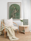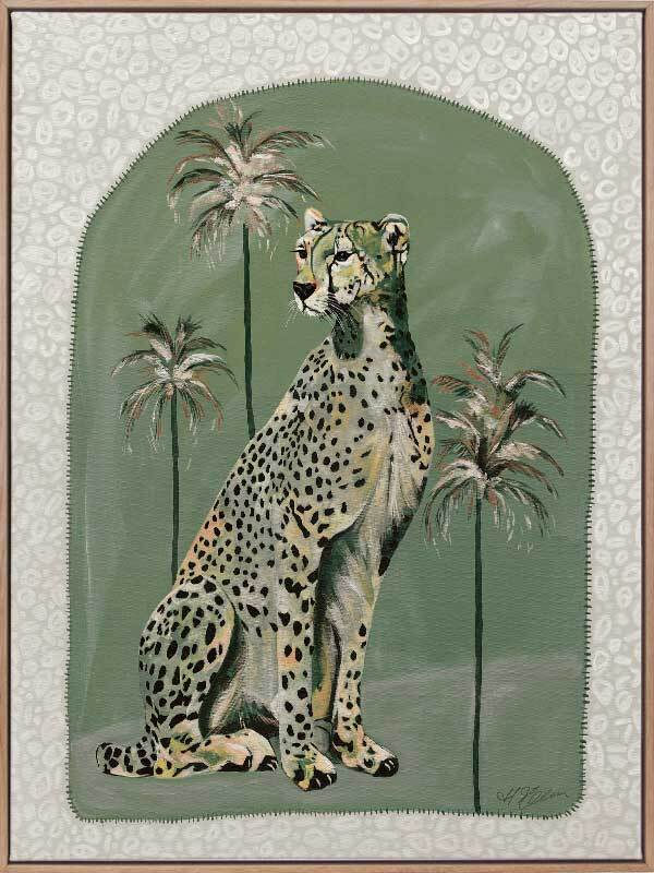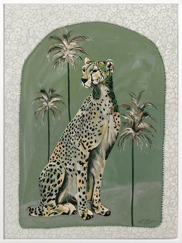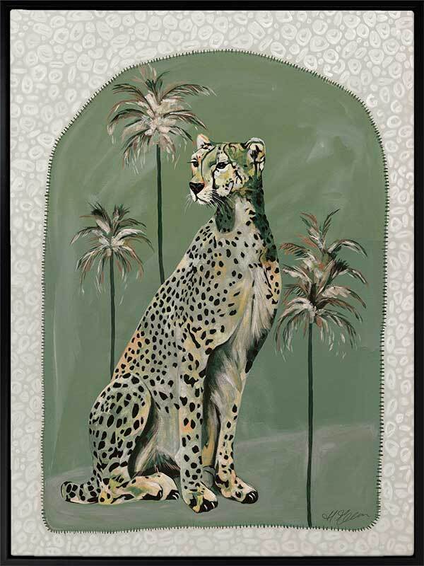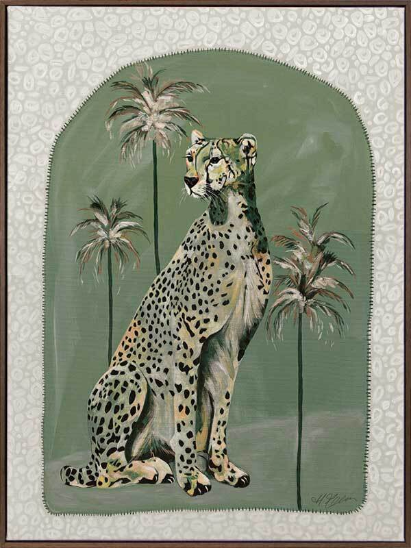 Thinking Of You Green Canvas Art Print - Fun and inviting, this boho-inspired piece features a regal cheetah, enjoying a moment among the palm trees on a warm summer's night. A calming palette of soft khaki green tones complements funky shapes and patterns throughout the work.