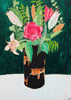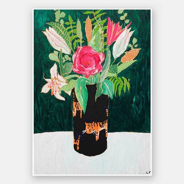 Tiger Vase - This poster is a floral still life in a playful abstract style. The art print portrays oriental lilies and a demure rose painted in thick brushstrokes using acrylic paint with striking bold colours of pink and magenta set against a deep emerald green background. The flowers are in a super cute black and orange tiger vase giving the are a playful composition. Lara Meintjes is a US-based, South African painter who isn't afraid to experiment mixing bold colours with soft floral imagery. The depth of imagery in her pieces inspires you to find the calm within the chaos.