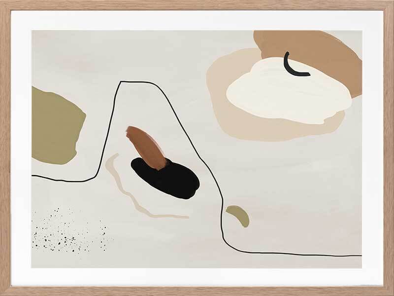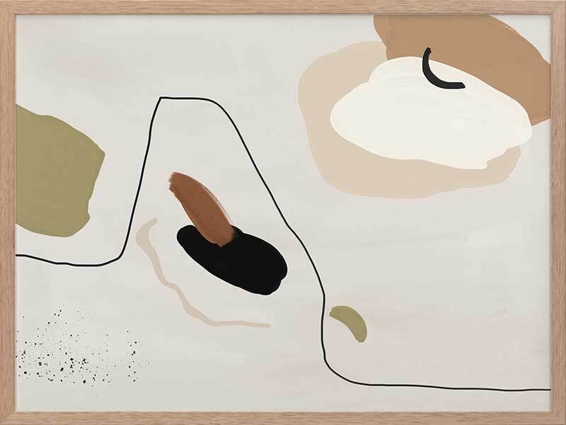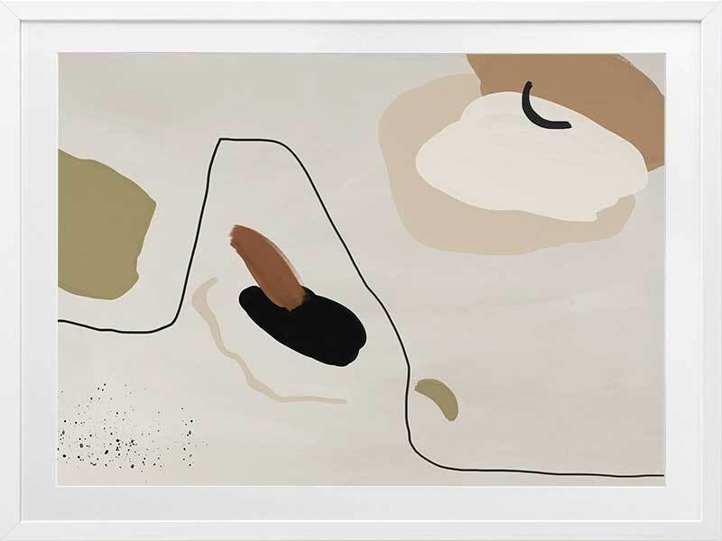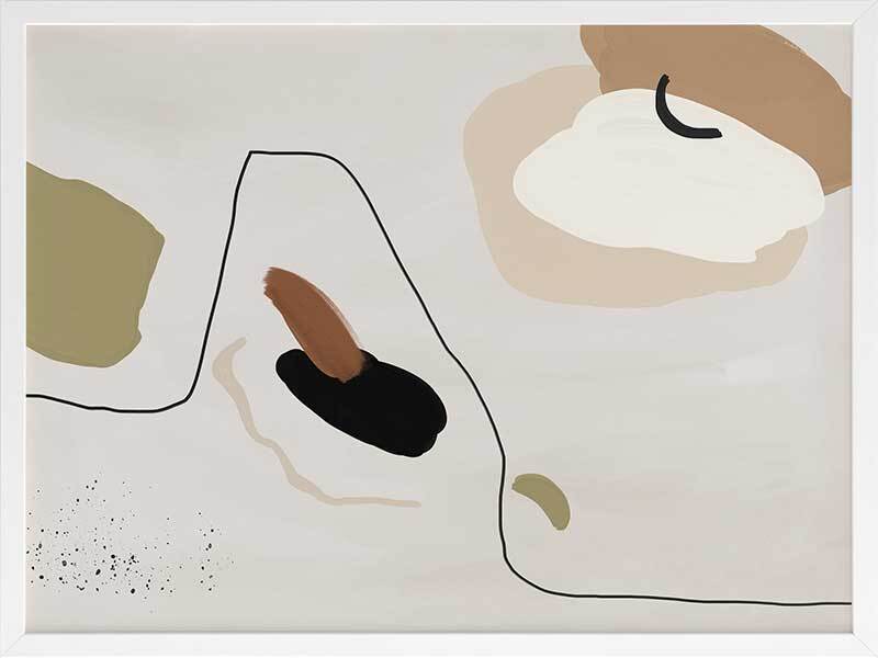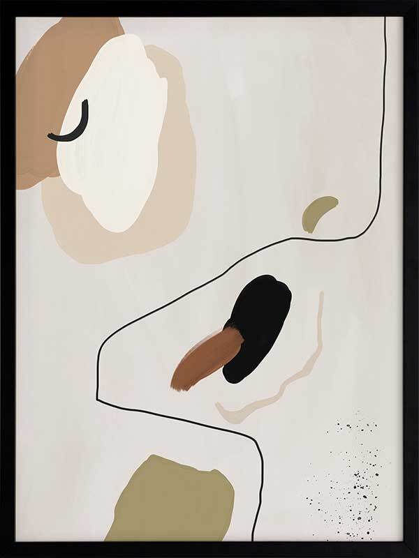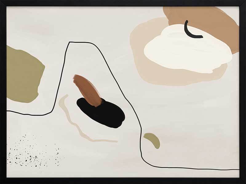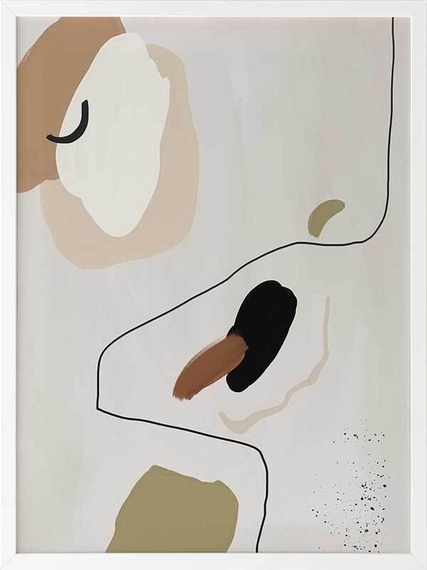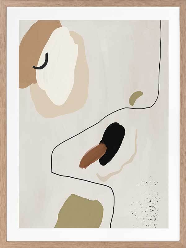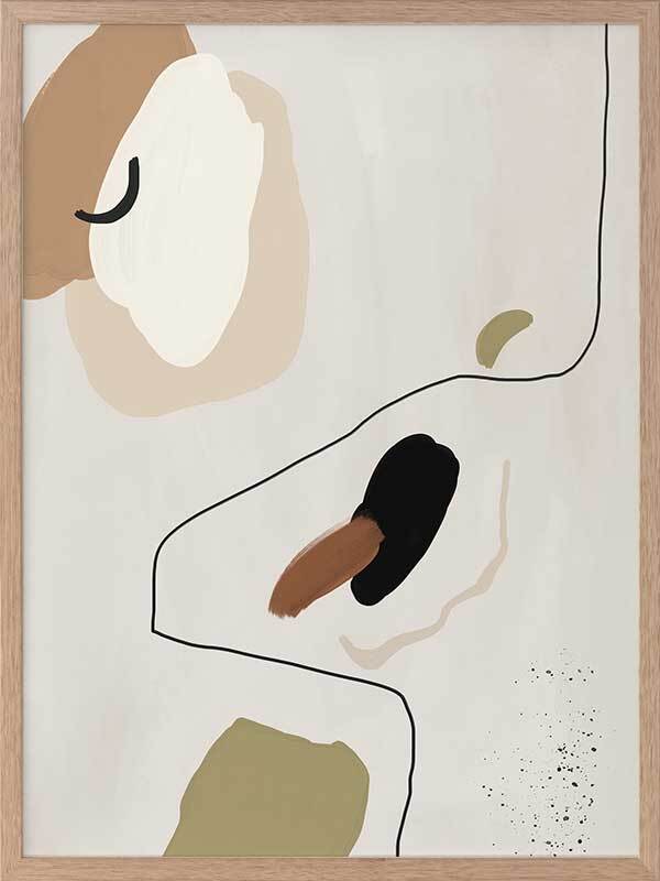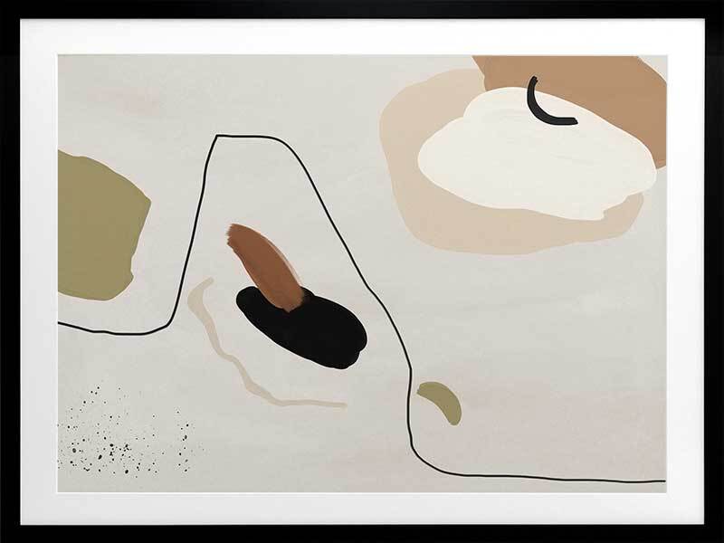 To the Wire I Framed Art Print - Playful lines and shapes and warm, muted tones combine in this minimalistic abstract piece. Featuring a neutral yet sophisticated palette of soft beige, khaki green and a hint of black. Matches with To the Wire II and III.