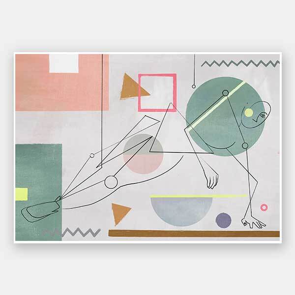 Tomber Unframed Art Print - "Tomber" - To fall. Deconstruct the way you look at the world with this unique perspective of a female figure, fallen elegantly to the floor. Using fragmented shapes and lines, with unfinished details for a relaxed look, this abstract piece brings a sense of movement with its expressive design. A palette ranging from peach, pink, green, pale blue, golden yellow and warm brown makes this piece the perfect balance between colourful and neutral to suit any interior style.