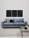 Treble Canvas Art Print: A clean, minimalistic artwork featuring thin overlapping lines on a black background. Can be displayed individually, or as a set with Apex and Isometric. 2018 AUTUMN/WINTER COLLECTION: CONTINUUM