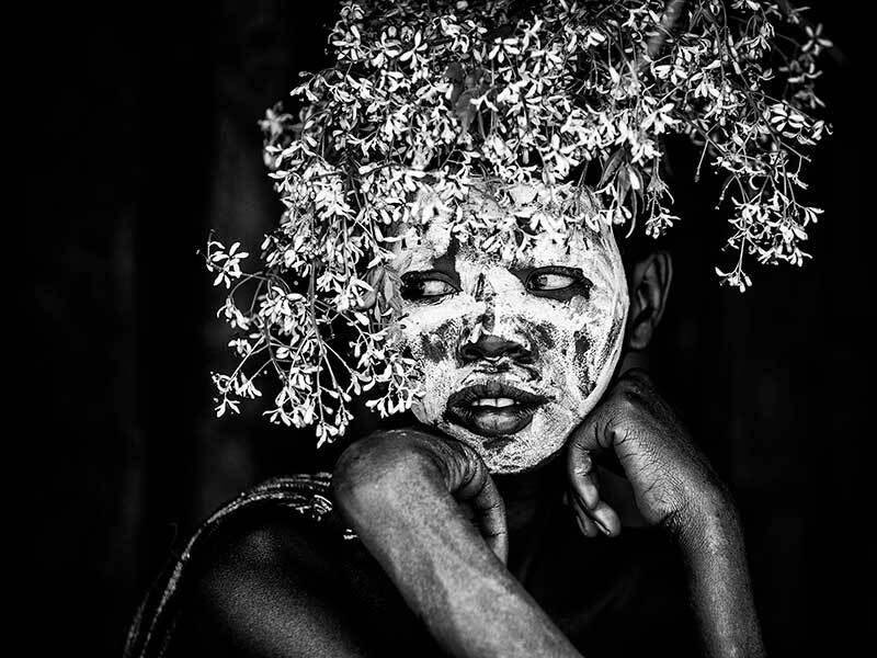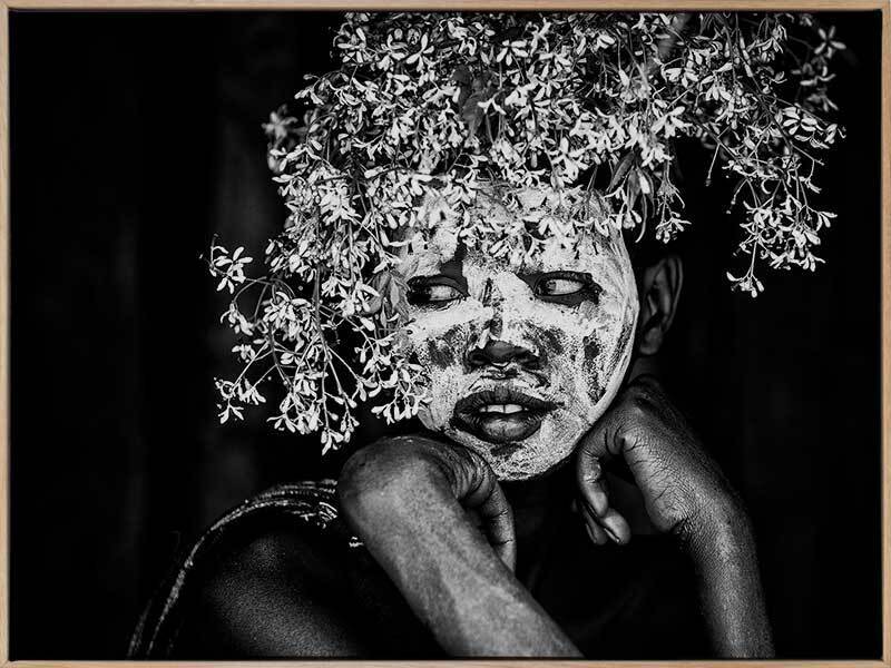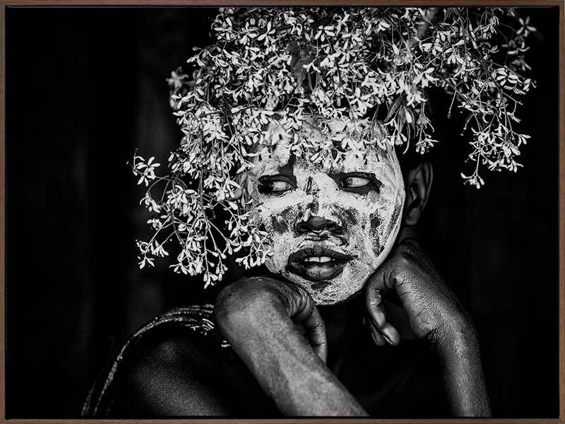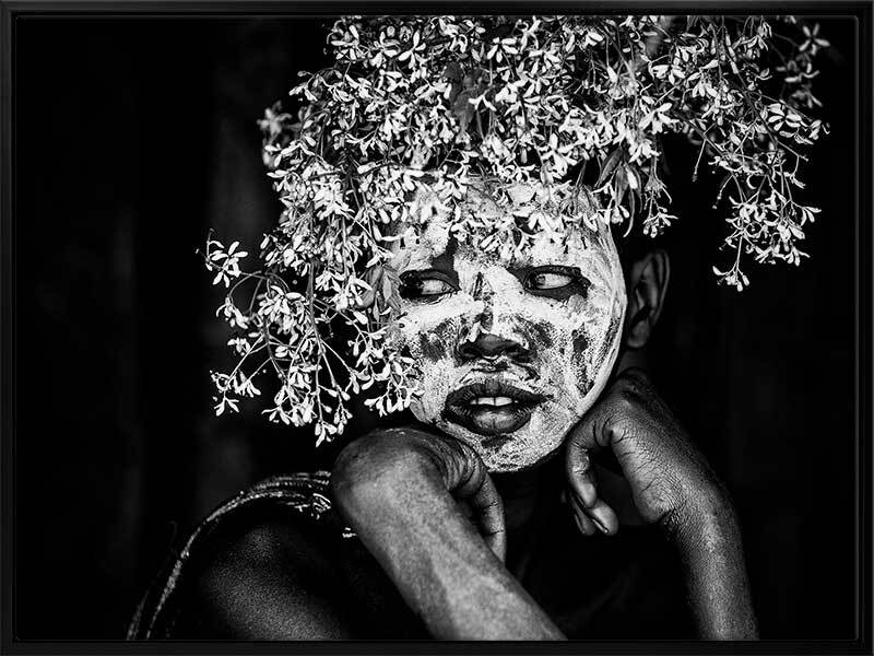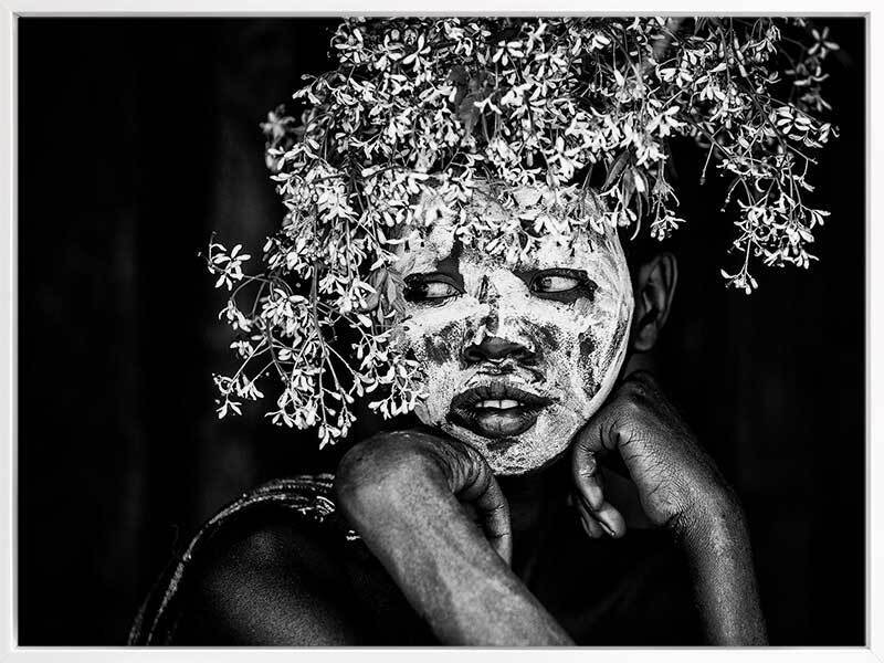 Tribal Flowers I Art Print - A beautiful black and white photographic art print of a young tribal member decorated in white face paint and adorned with a floral headdress, sitting quietly contemplating the ceremony they are sure to take part in. This deeply contrasted black and white print makes a strong statement and pairs wonderfully with Tribal Flowers II. THE CURATED SERIES II A handpicked gallery of wall art photography that is daringly and quirky, these photographic pieces are exploding with richness of colour and texture.