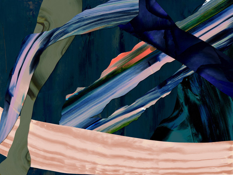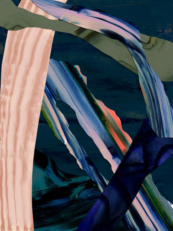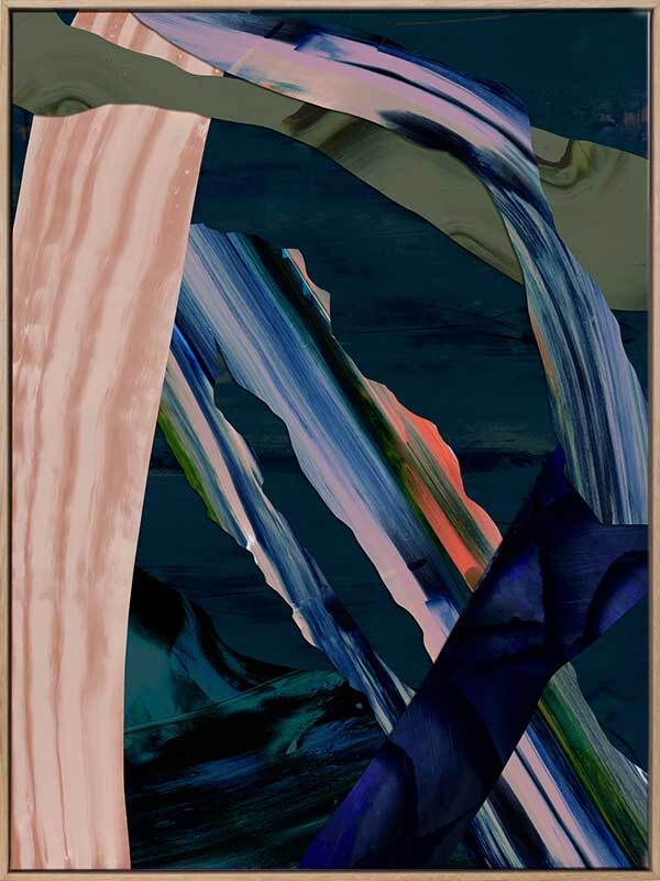 Tribeca Canvas Art Print: A texture-rich, multi-layered abstract artwork featuring a beautiful, contrasting colour palette of rich blues, soft pinks, and pops of bright orange. 2020 AUTUMN/WINTER COLLECTION: REVERIE