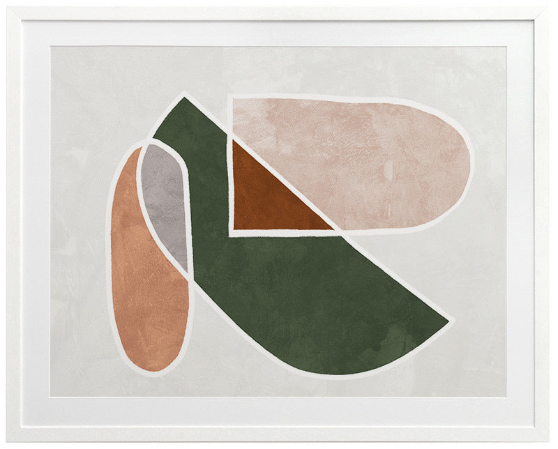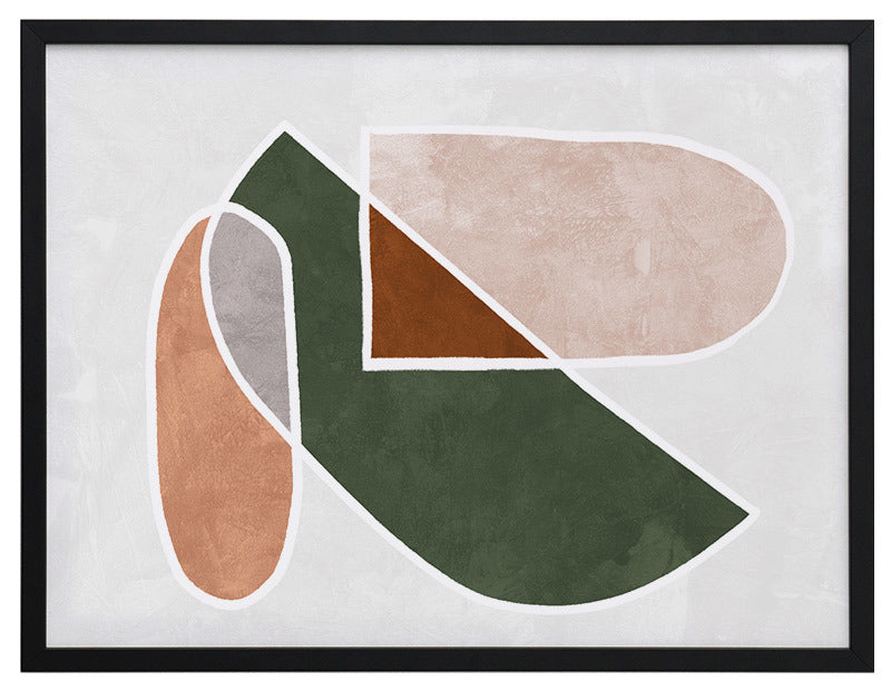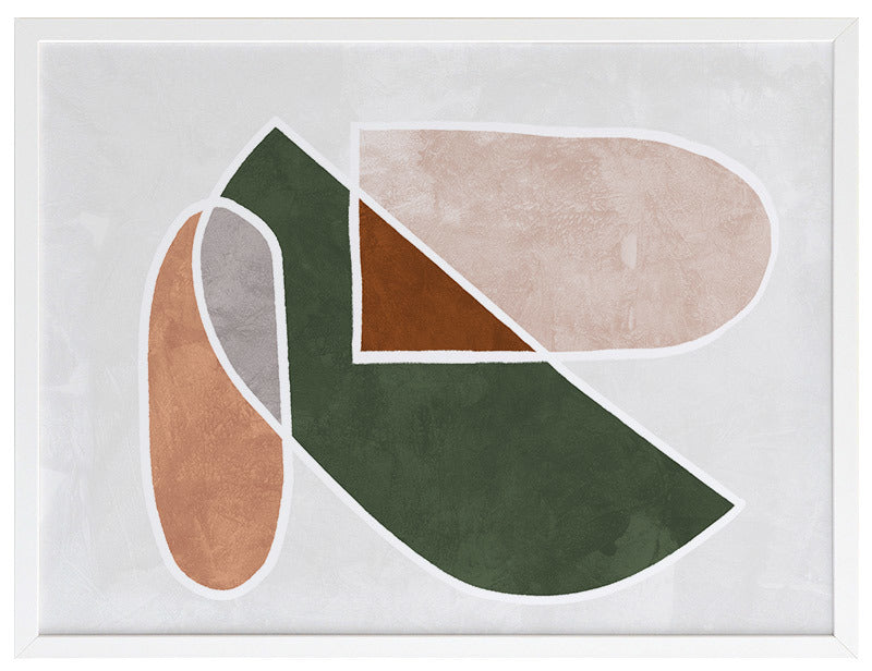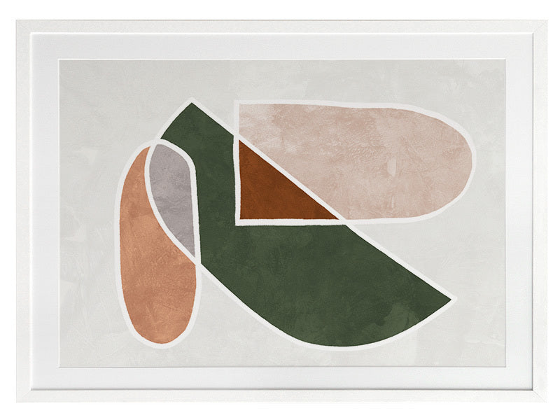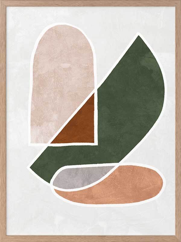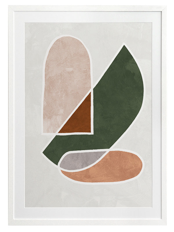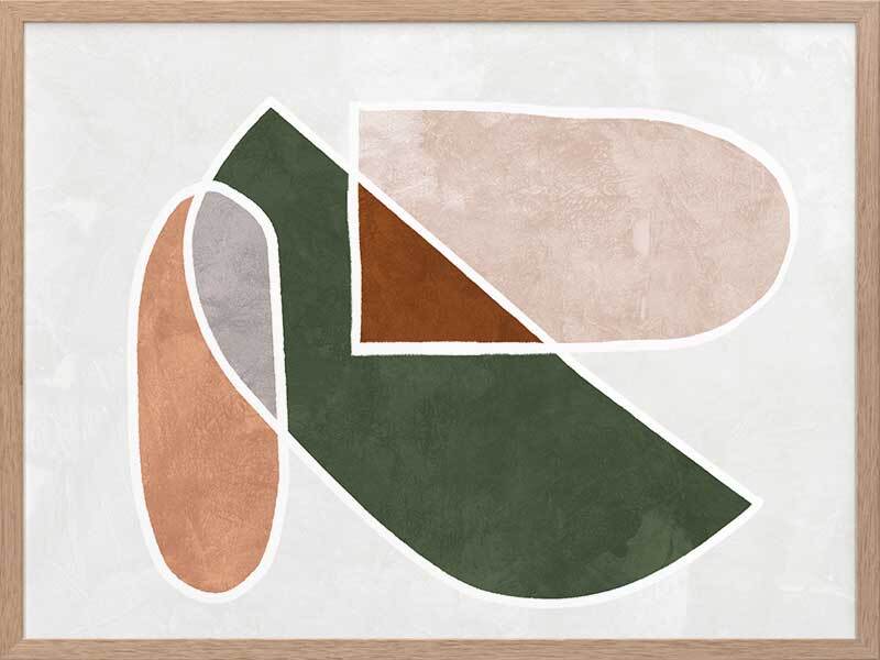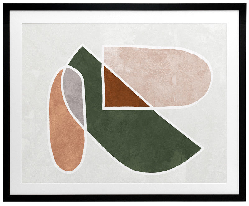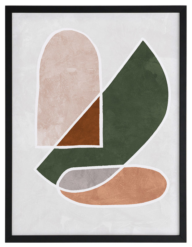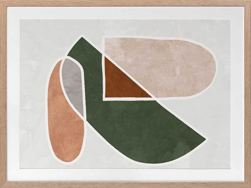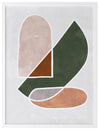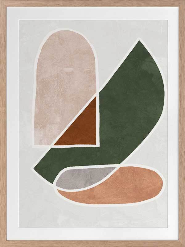 Trilogy Framed Print: A beautifully balanced abstract artwork featuring an intersection of geometric shapes in muted green, terracotta and red shades. Companion piece to Tetrarchy. 2018 AUTUMN/WINTER COLLECTION: CONTINUUM