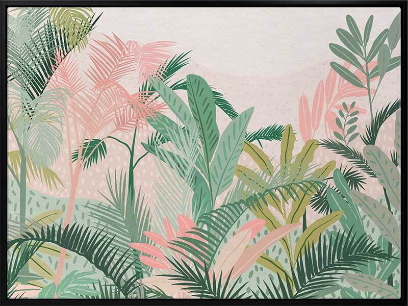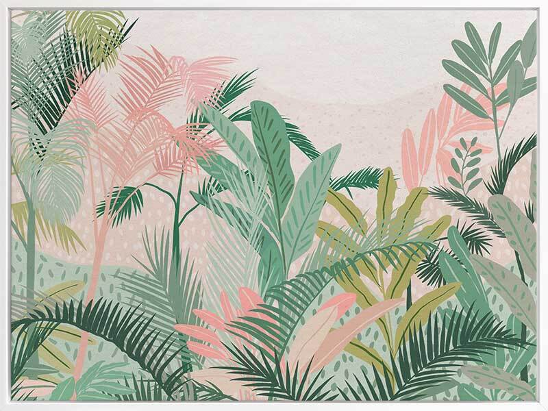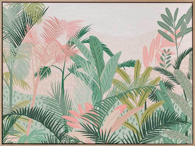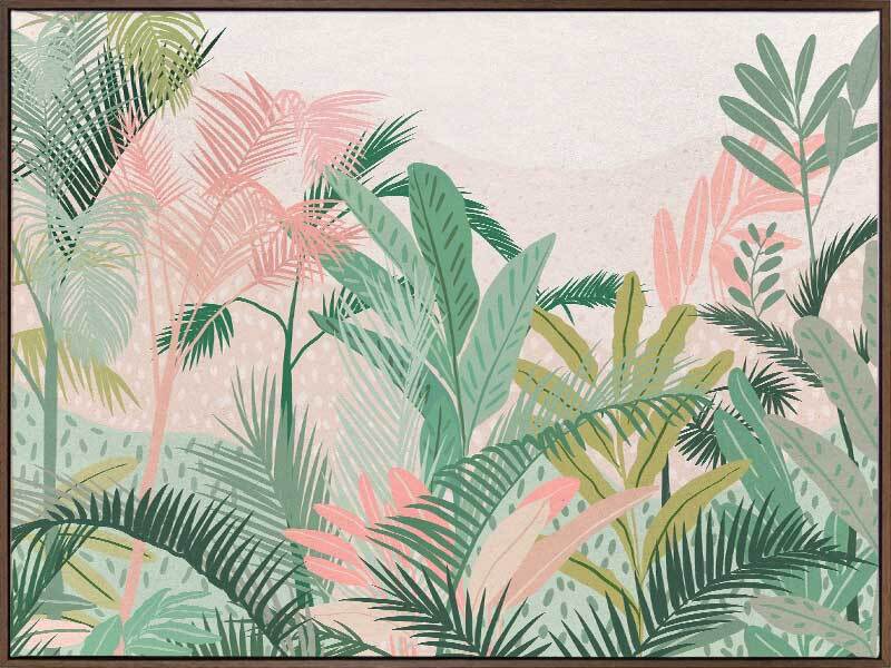 Tropical Mojito Canvas Art Print - Playful and feminine, this soft and ethereal spin on the classic tropical style features layers of trees, palms and foliage. The colour palette showcases soft pink, warm brown and mustard yellow.