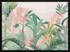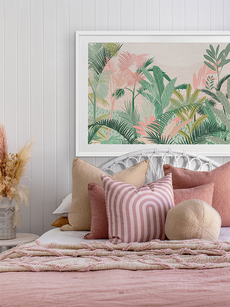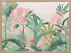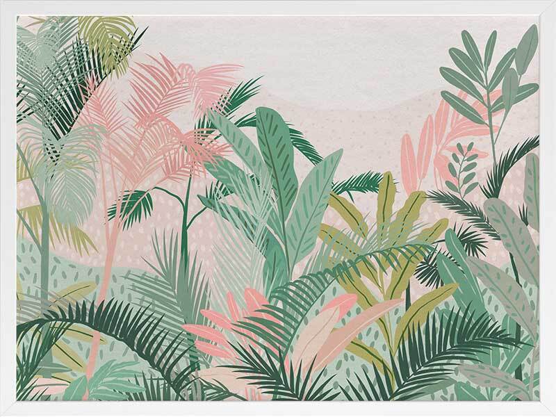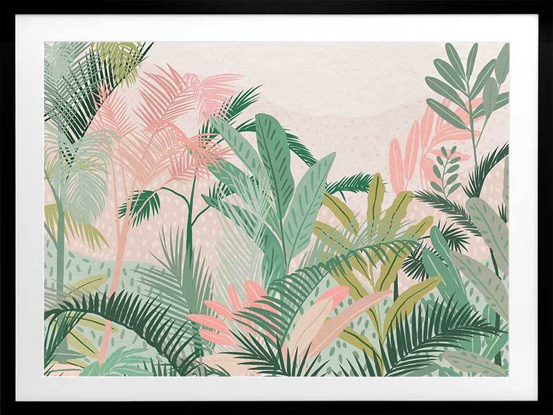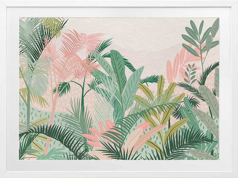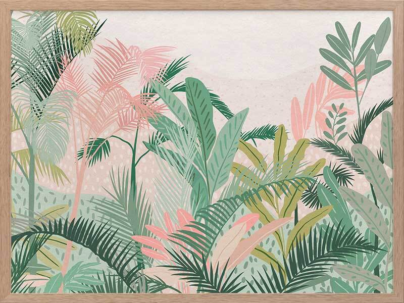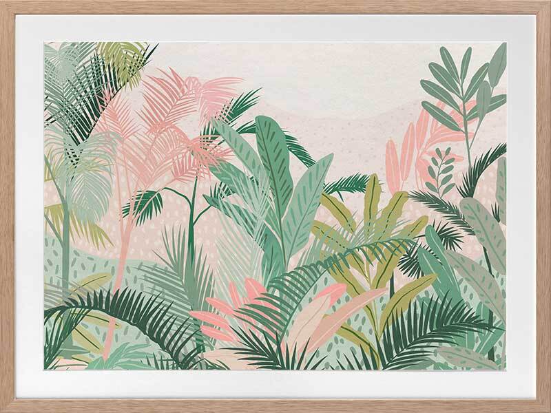 Tropical Mojito Framed Art Print - Playful and feminine, this soft and ethereal spin on the classic tropical style features layers of trees, palms and foliage. The colour palette showcases soft pink, warm brown and mustard yellow.