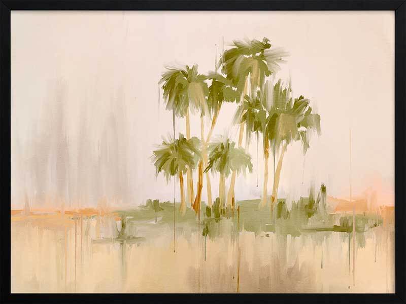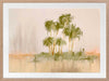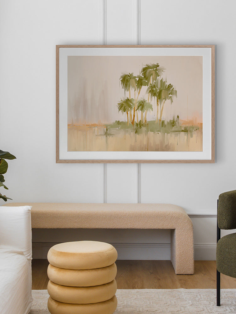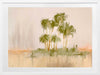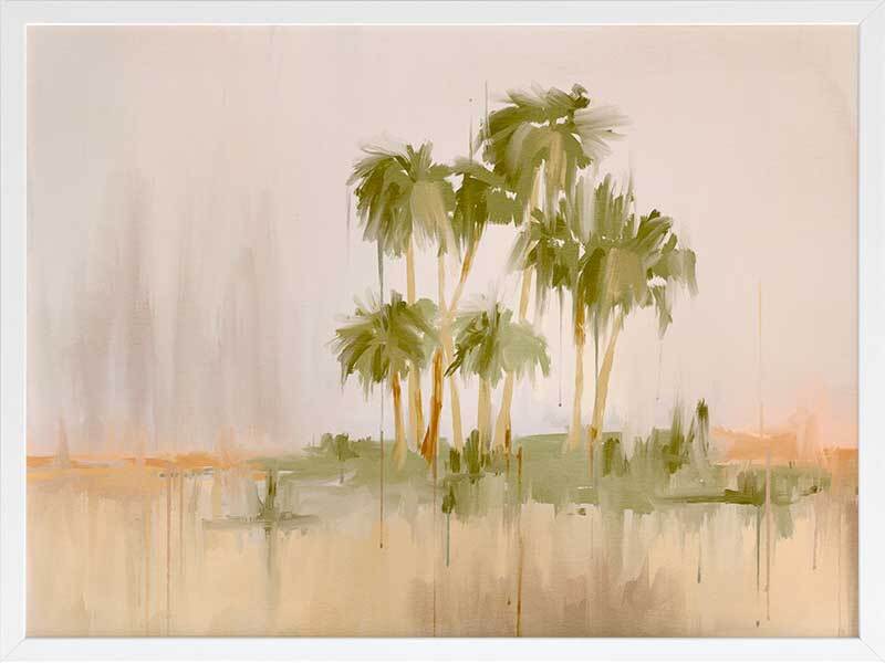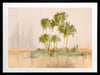 Tropical Sunset III Framed Art Print - As the warm, golden light of the setting sun basks these windswept palm trees, you can hear the tropical birds cawing in the distance. This dreamy piece features a soft colour palette of buttery yellow, khaki green, and hints of orange, all against a pastel-toned backdrop, reminding us of a warm, coastal oasis.