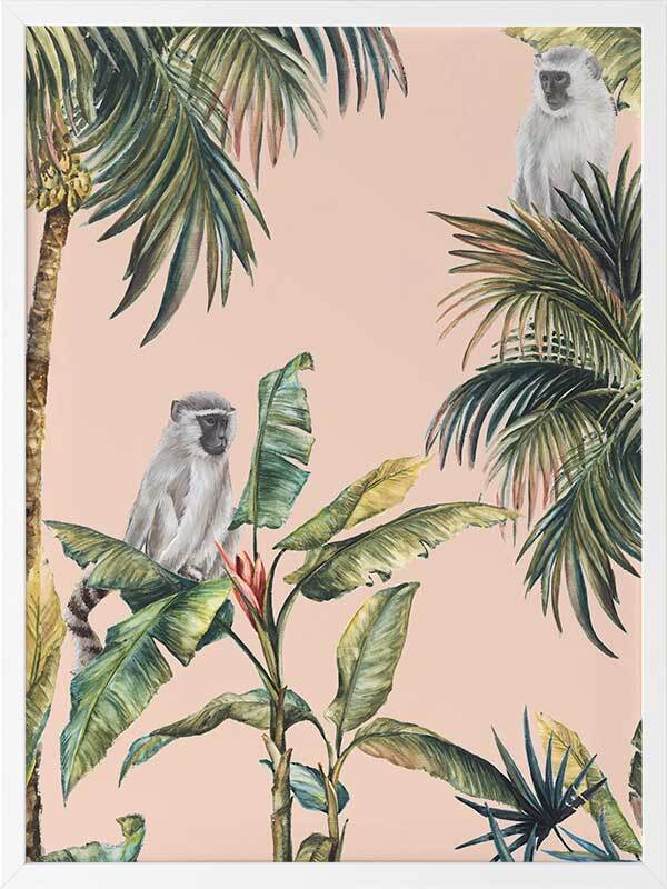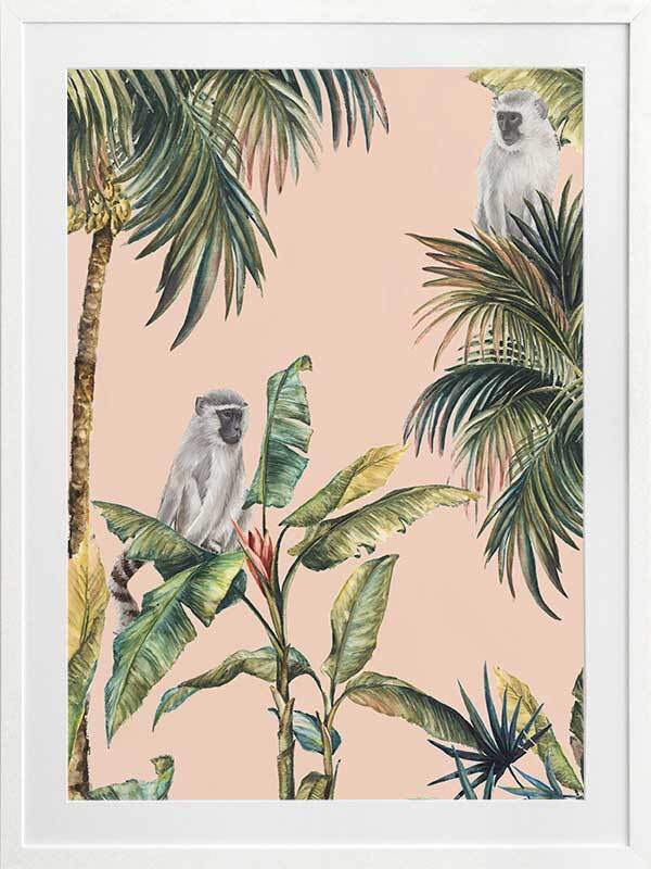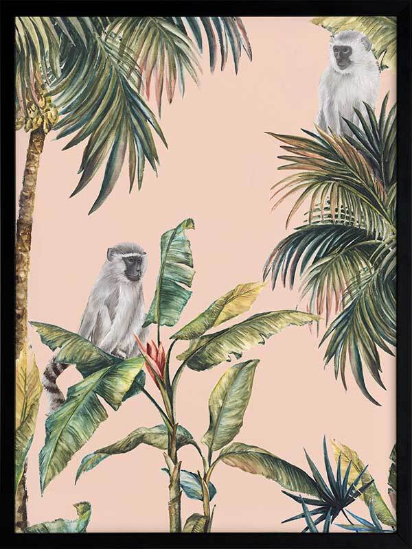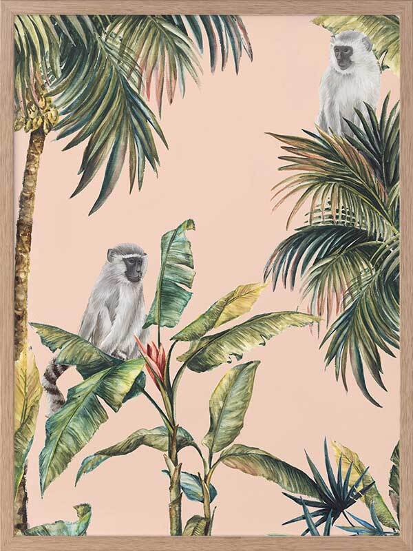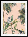 Tropicano I Framed Art Print - Step into the warm air of the tropics with this stunning artwork, featuring realistic tropical plants and inquisitive little monkeys. A clean pale pink background brings forward the green, yellow and blue tones, with light grey and black for each monkey. You can almost hear the birds cawing, insects buzzing, and faint trickle of water from the nearby riverbed.
