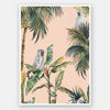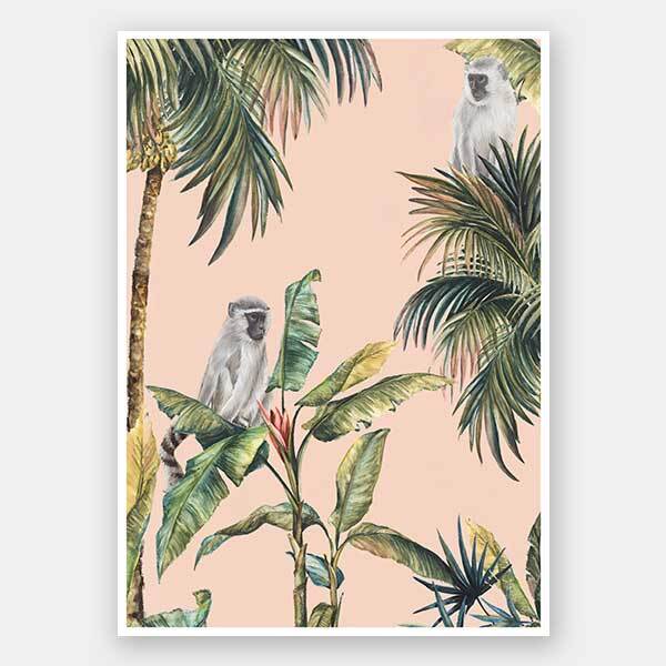 Tropicano I Unframed Art Print - Step into the warm air of the tropics with this stunning artwork, featuring realistic tropical plants and inquisitive little monkeys. A clean pale pink background brings forward the green, yellow and blue tones, with light grey and black for each monkey. You can almost hear the birds cawing, insects buzzing, and faint trickle of water from the nearby riverbed.