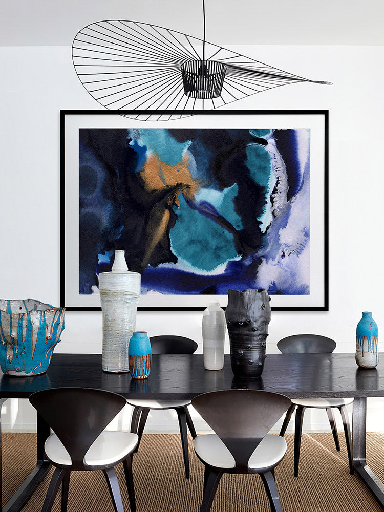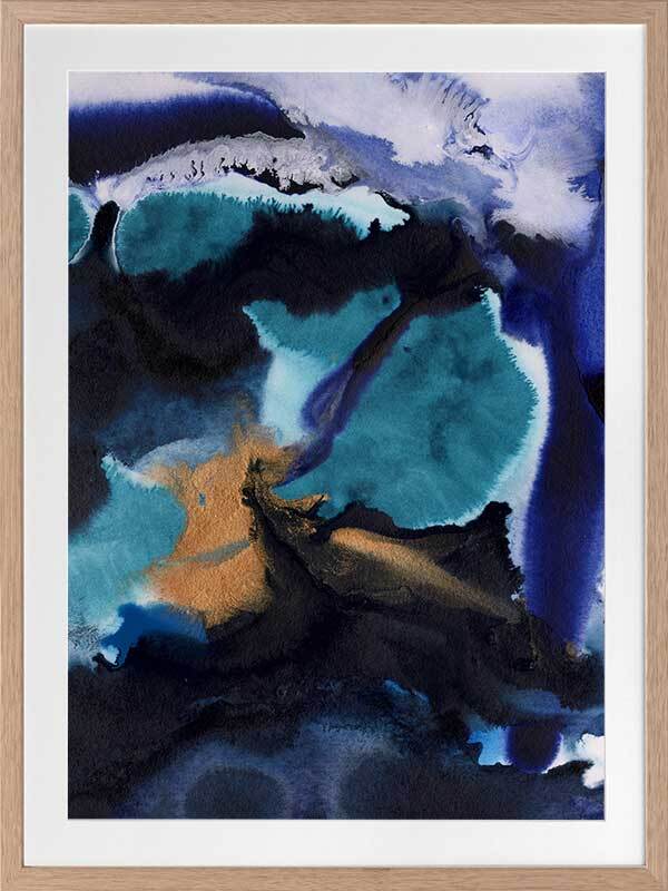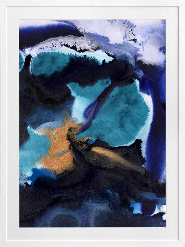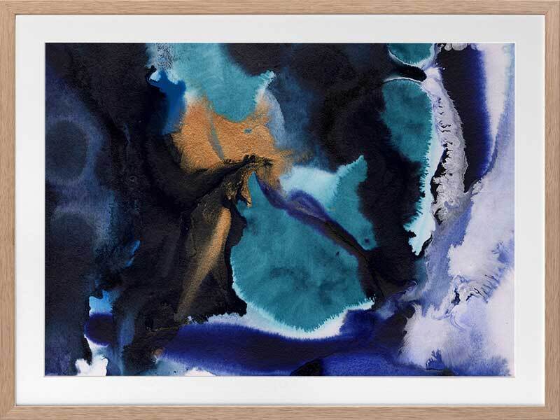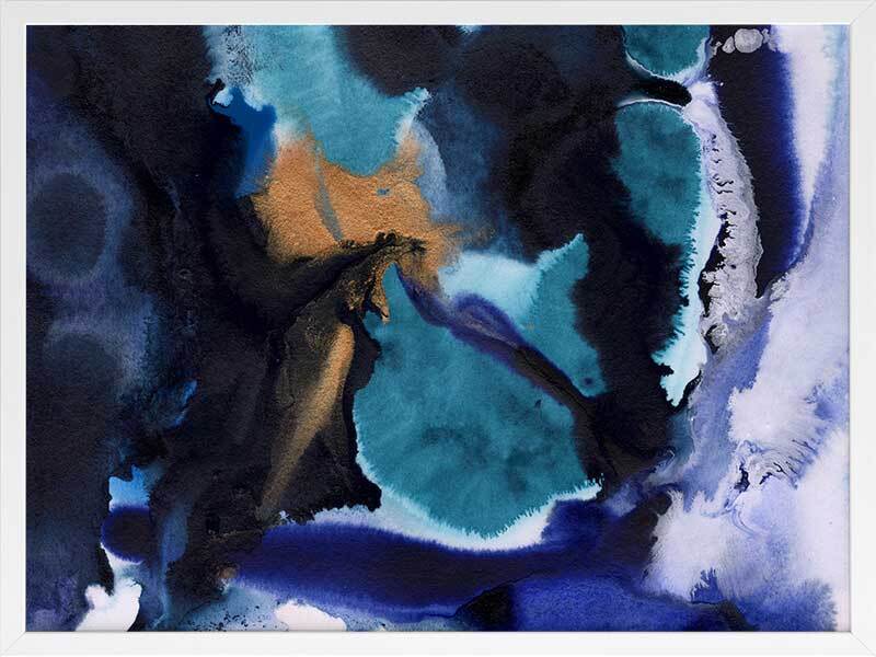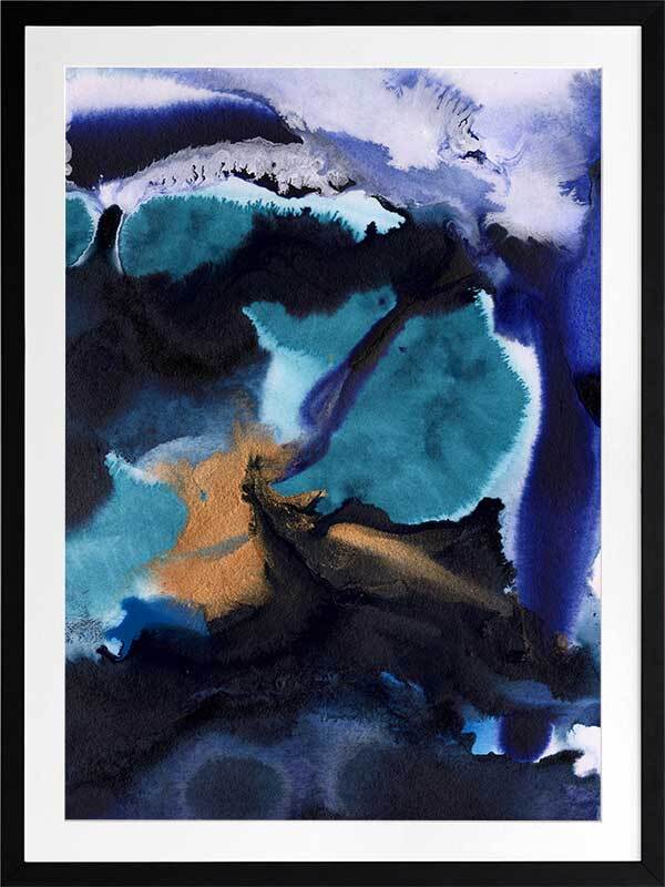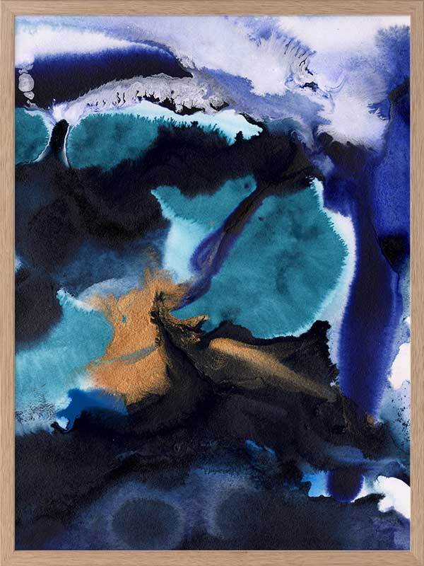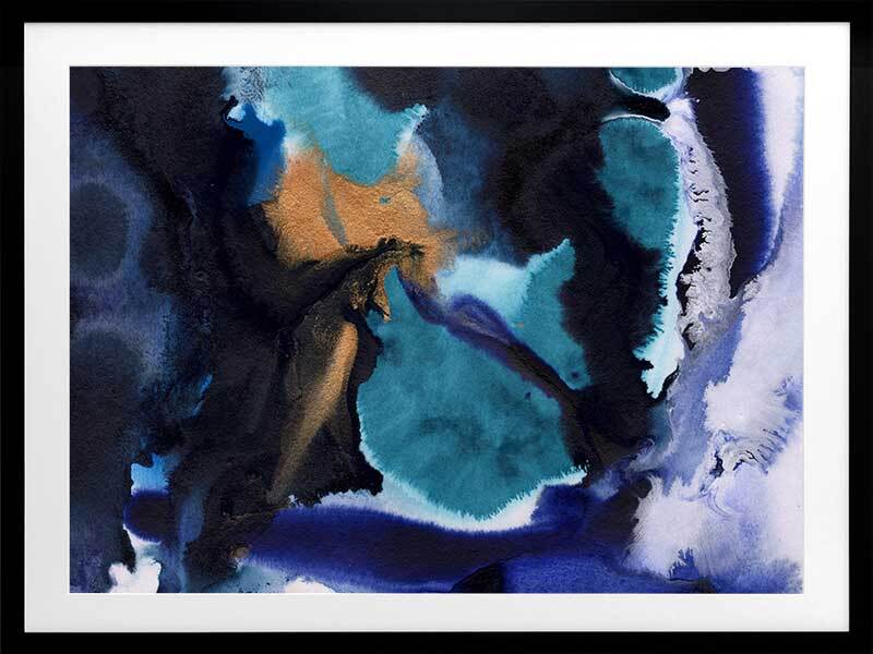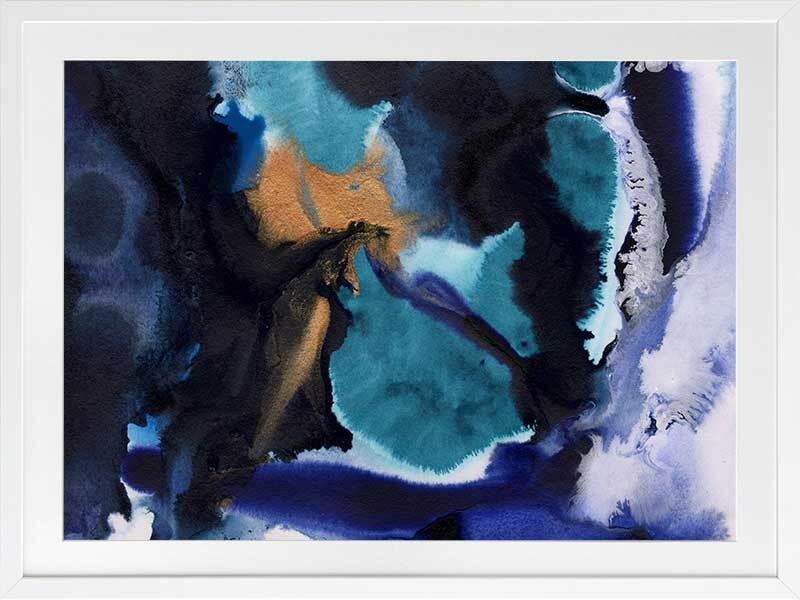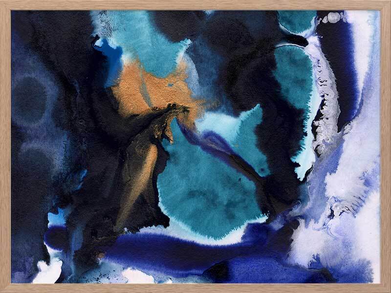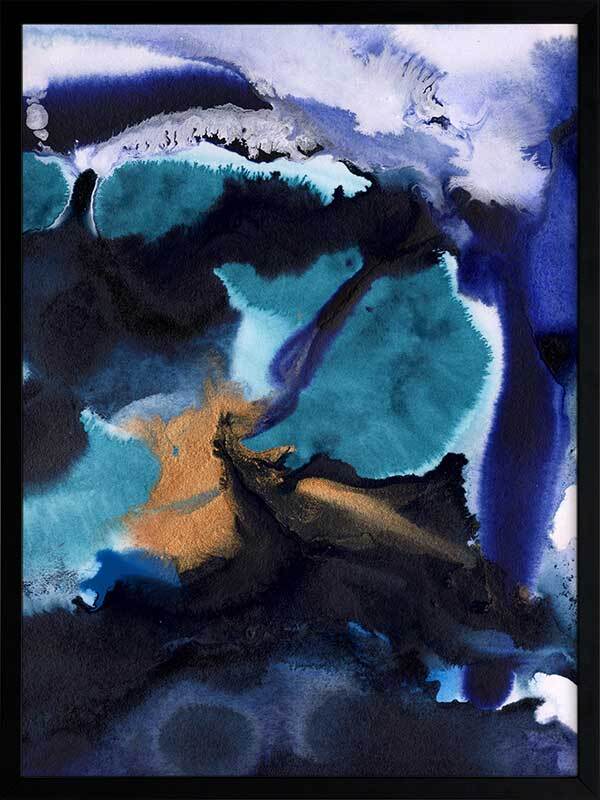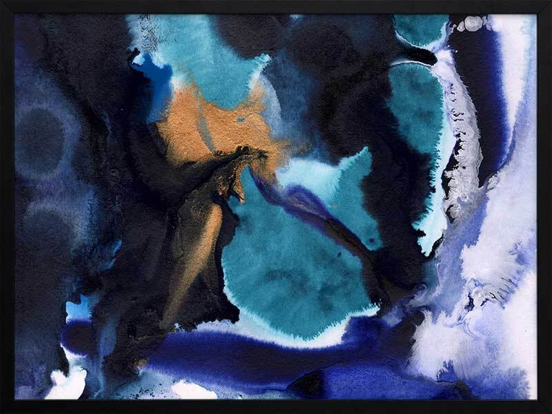 Tsunami II Framed Print: A spectacular swirl of colours, this artwork features contrasting light and dark blues with a pop of gold. Pairs with Tsunami I. 2020 AUTUMN/WINTER COLLECTION: REVERIE