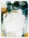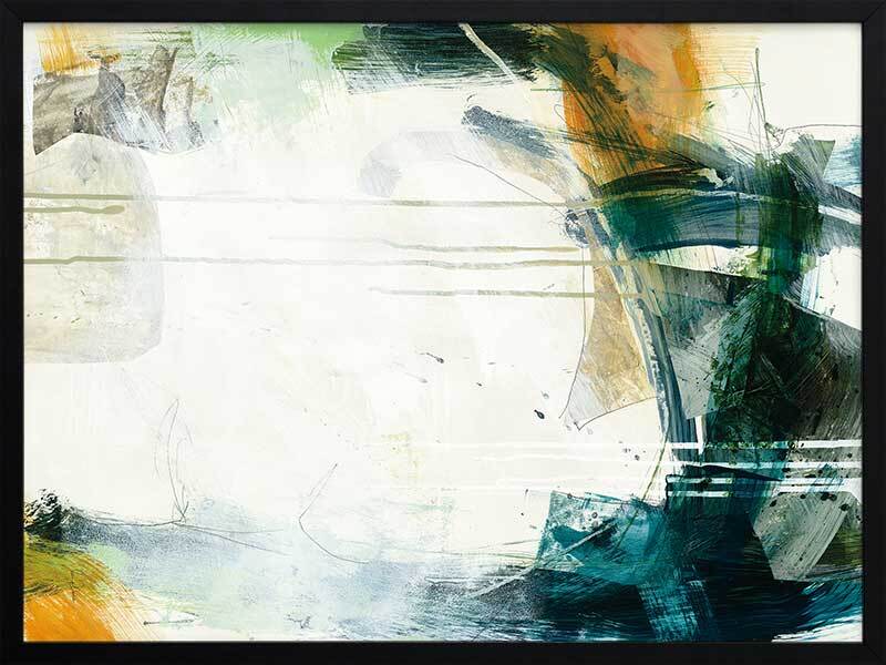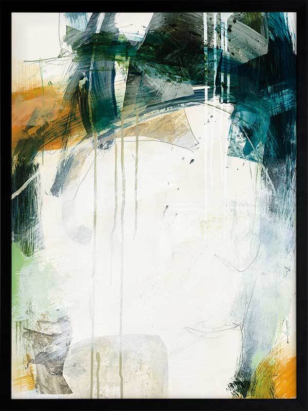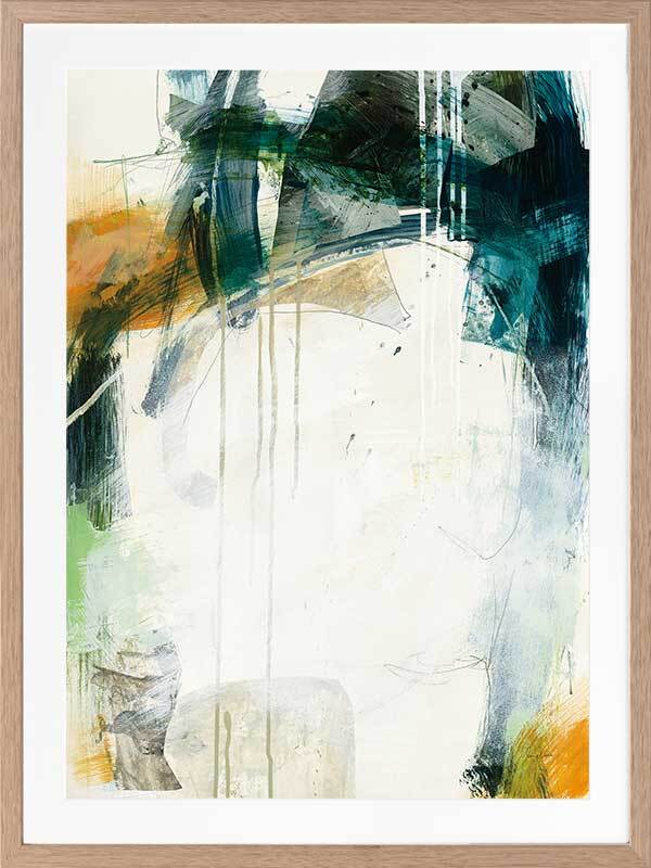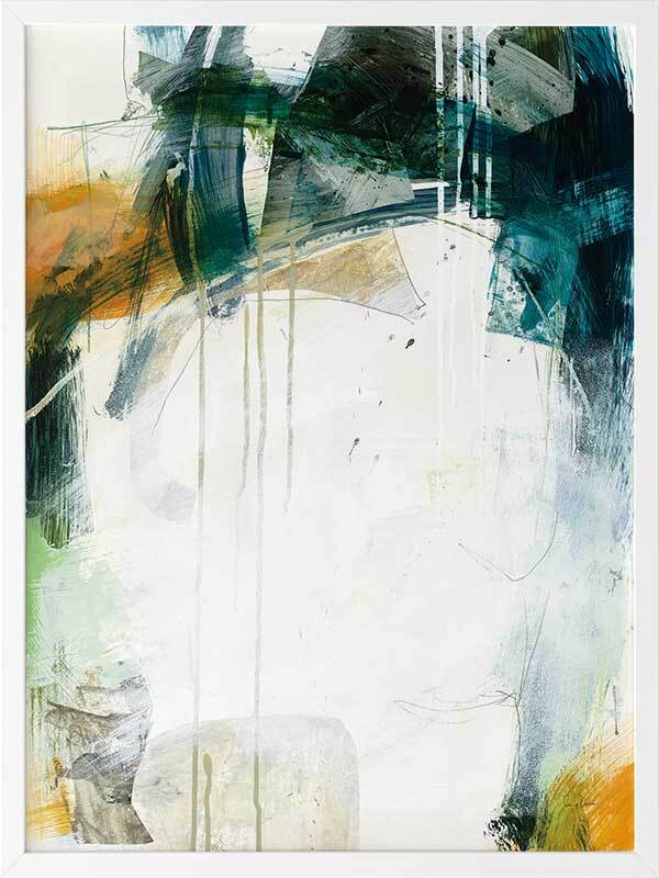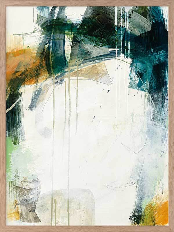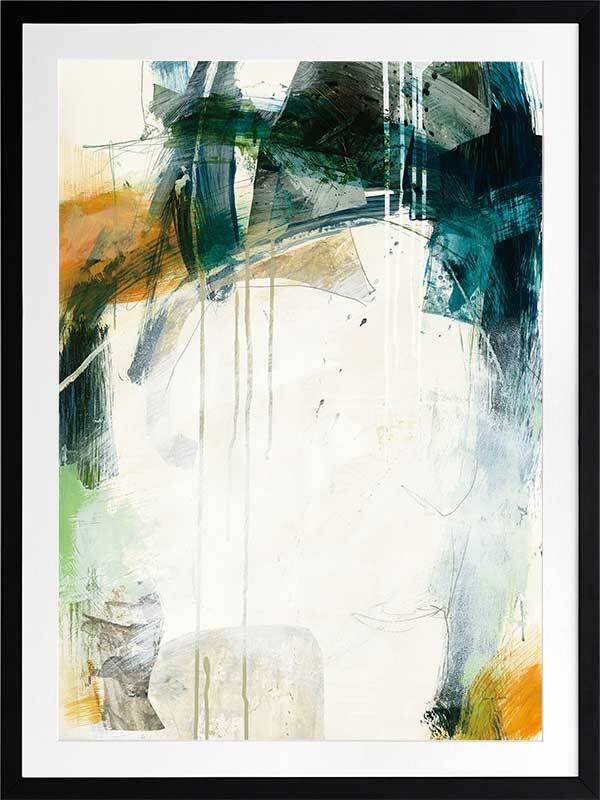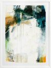 Turbulence I Framed Art Print - This formless abstract piece features a magnetic collection of swatches and strokes of paint, with a disruption of dripping lines and a stark white background. A cool colour palette of greens and deep blues contrast beautifully with pops of warm yellow.