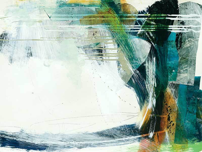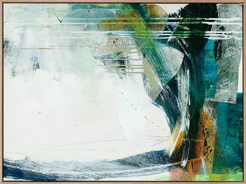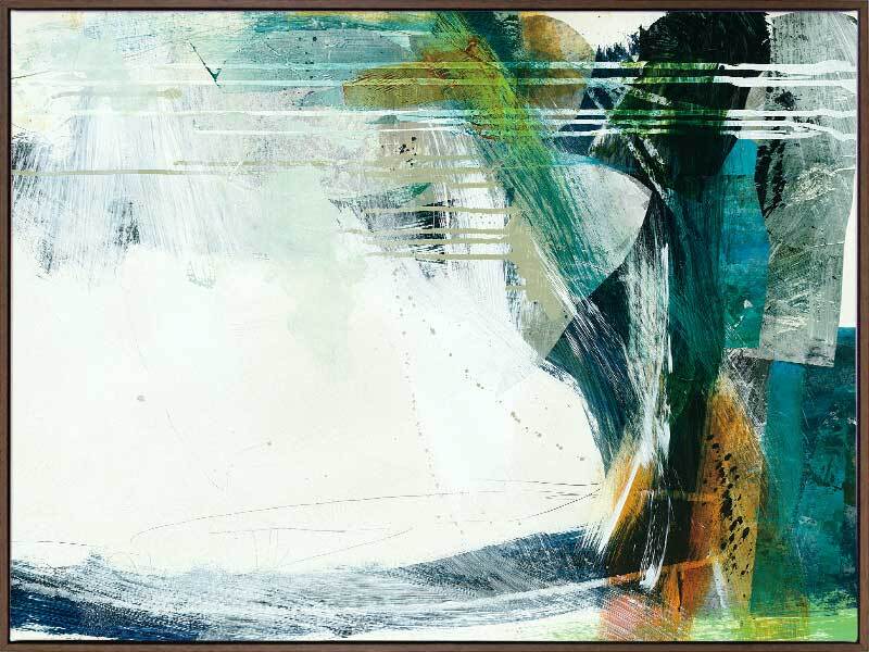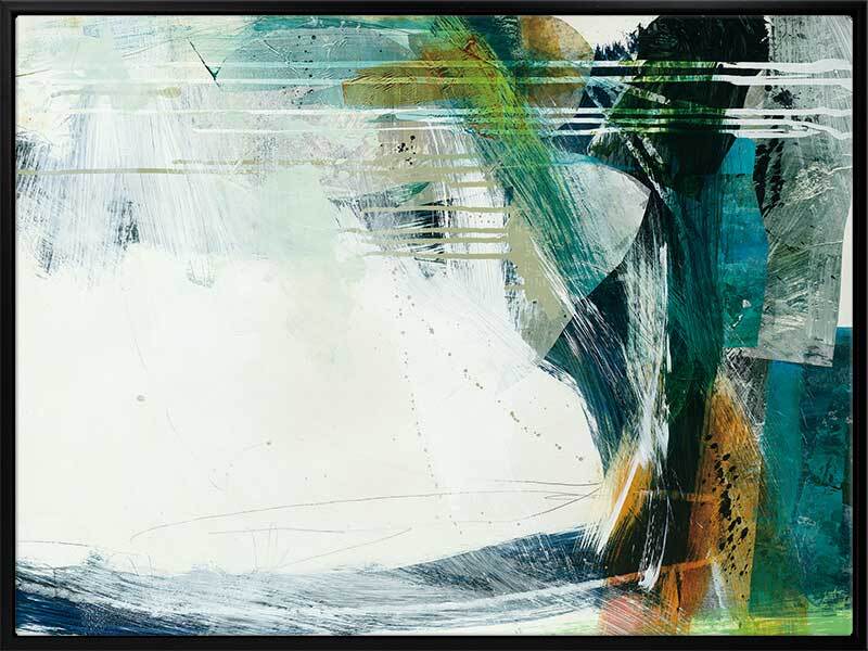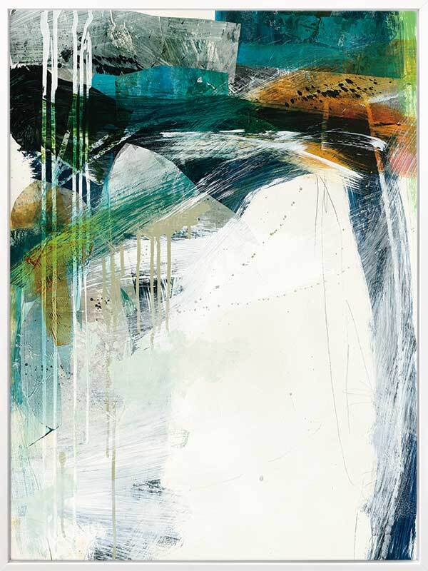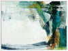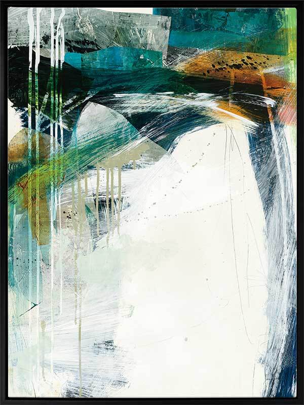 Turbulence II Canvas Art Print - This formless abstract piece features a magnetic collection of swatches and strokes of paint, with a disruption of dripping lines and a stark white background. A cool colour palette of greens and deep blues contrast beautifully with pops of warm yellow.