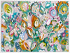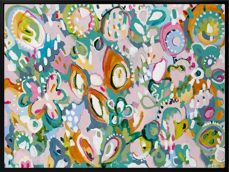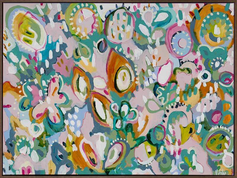 Tutti Frutti Canvas Art Print - Bold and playful, this artwork represents a layered play on colour, form and depth, through its use of loose, organic shapes, dots and strokes. The bright colour palette contributes to the sense of whimsy, featuring a base of pink and green, accented with warm orange and white.