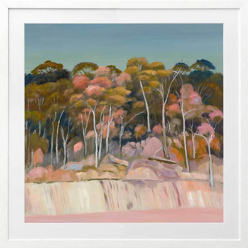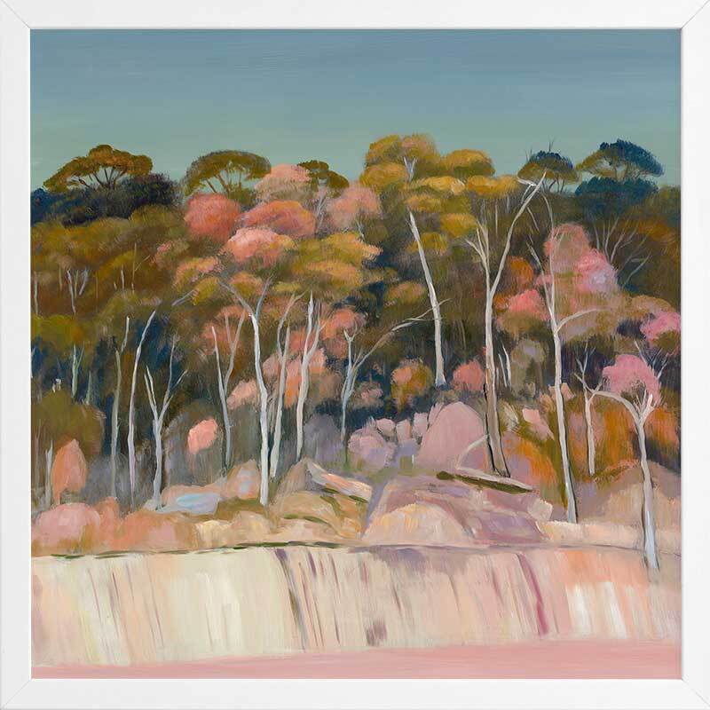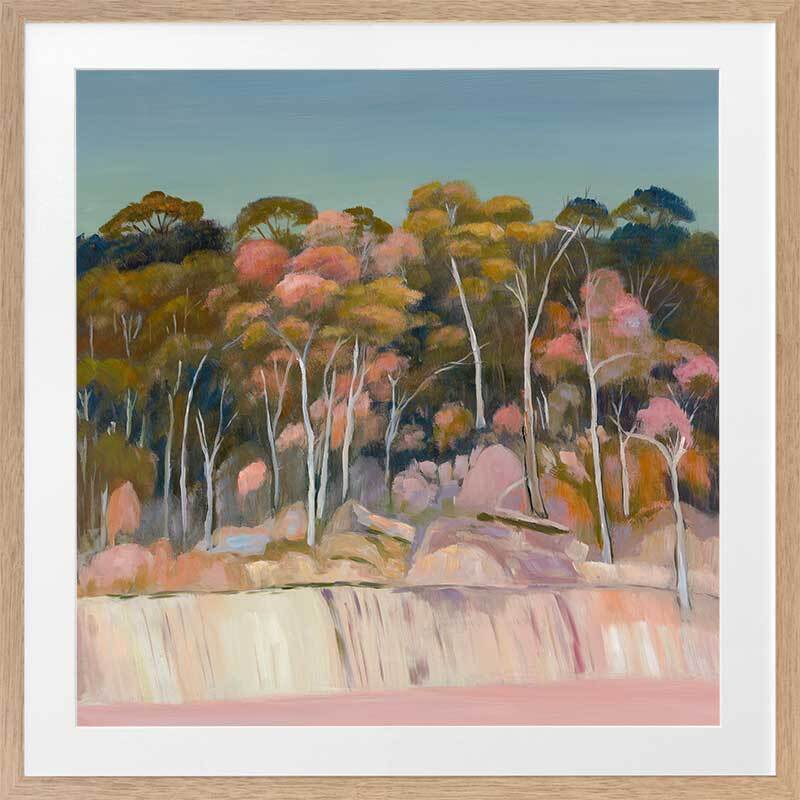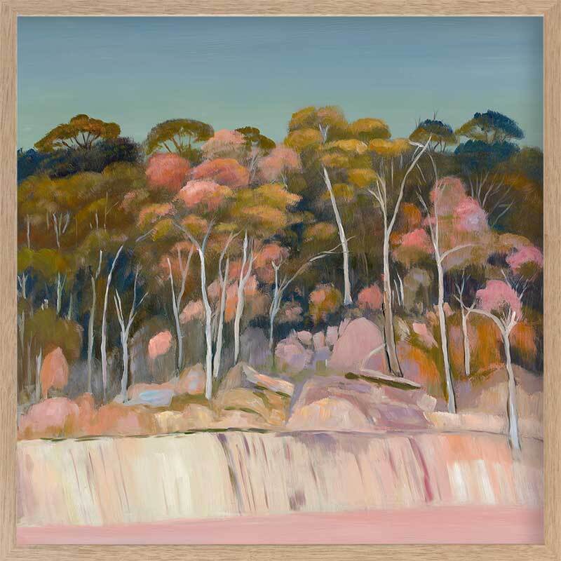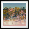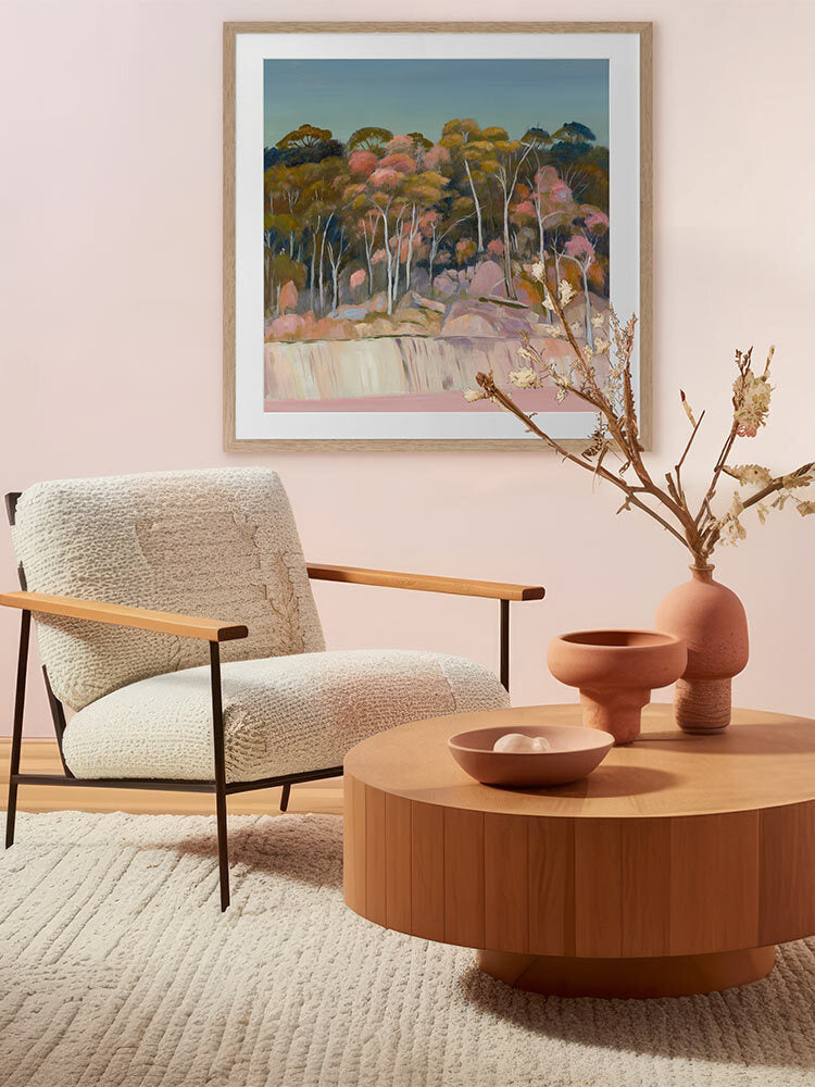 Twilight Canopy Framed Art Print - There's only one, single moment in the day when the light hits the gum trees just right - and they glow in magnificent colours that mesmerise every sense. This landscape artwork brings Australian flora to life with pastel pinks, purples, and yellows, softened by blues and greens. The calming energy of eucalyptus will envelop every space in tranquillity.