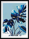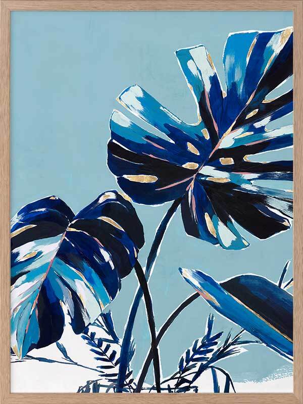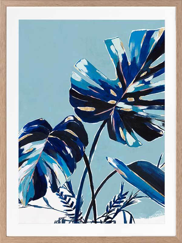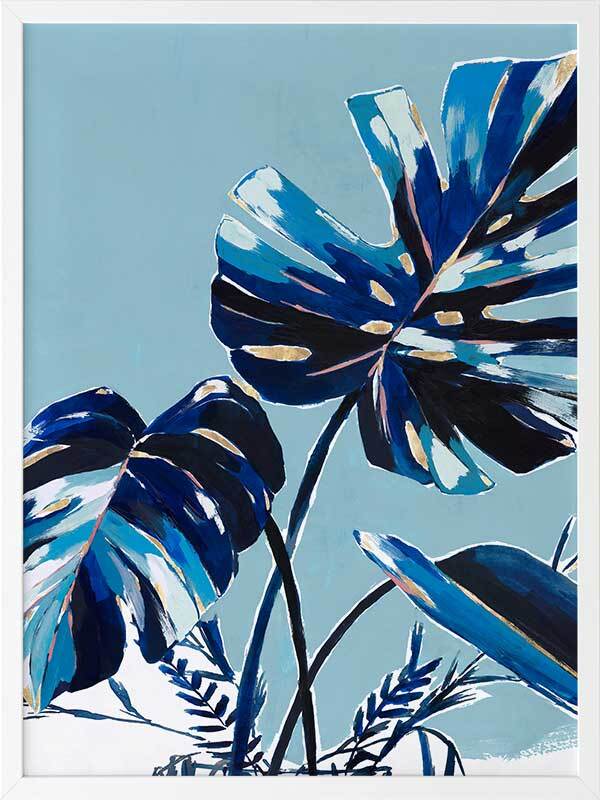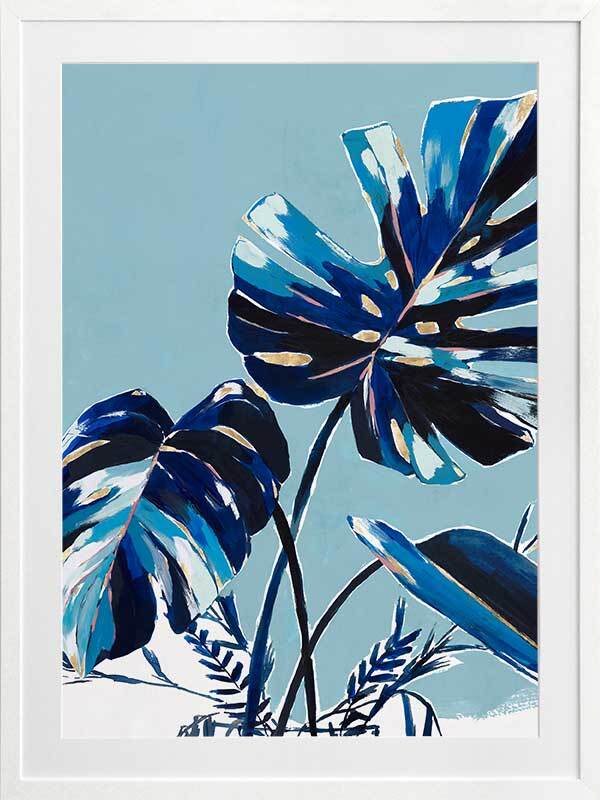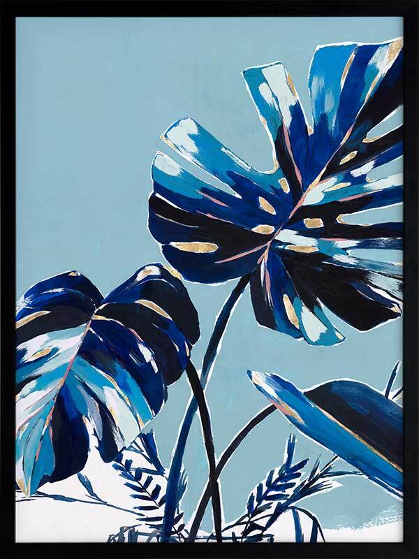 Twilight Tropics I Framed Art Print - An abstract look at mother nature, this artwork has a textural feel to it with painterly brush strokes and a playful colour blocking quality created with an obvious contrast between blue and black tones. An overall monotone palette is set off by pops of yellowish-gold and white.