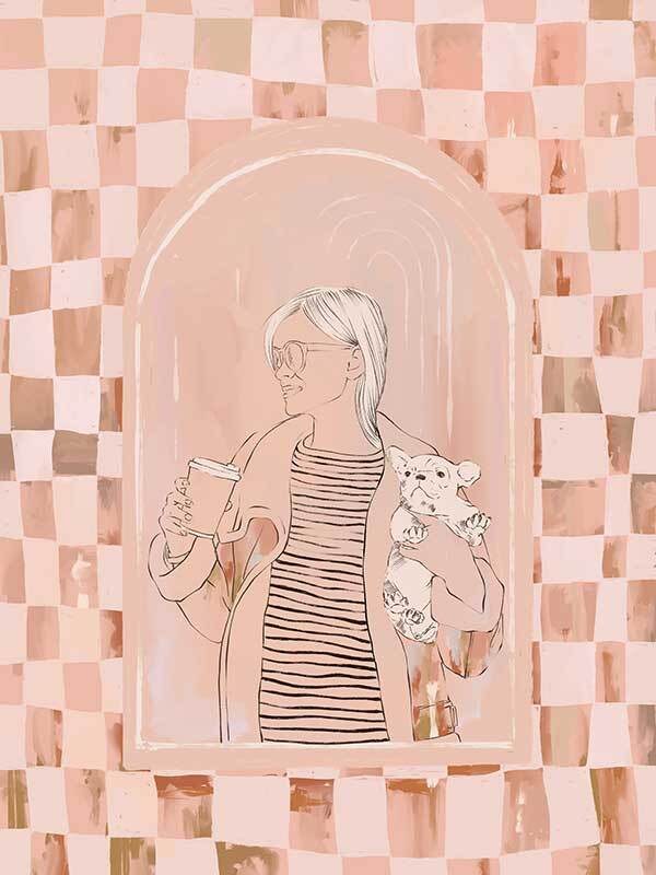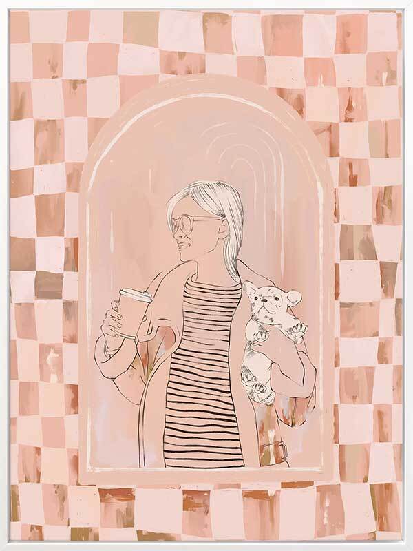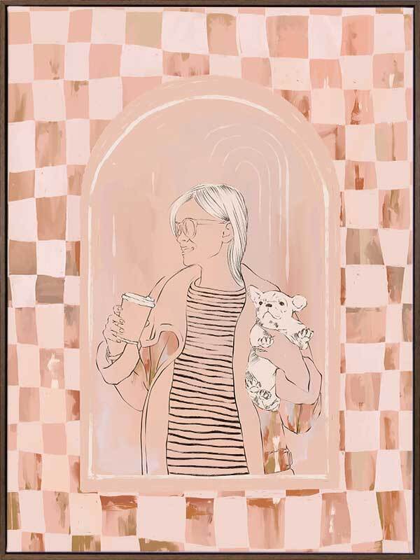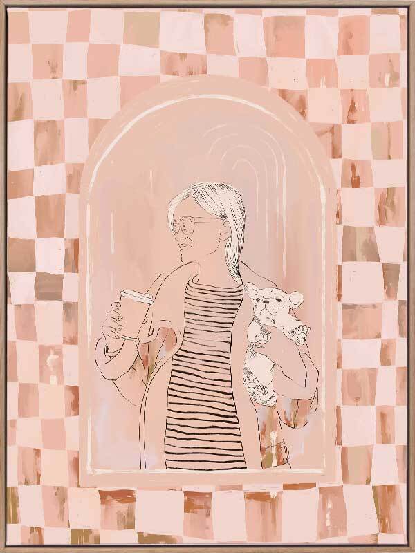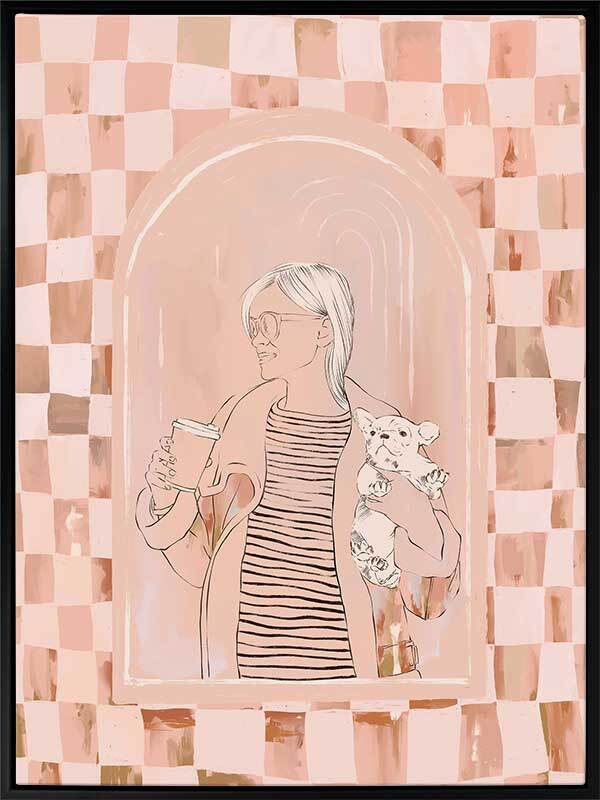 Two Loves Canvas Art Print - Coffee and puppies - for some, there are no two greater loves in this world. Perfect for your kitchen or bedroom, this piece brings a light-hearted energy with a soft pink palette with hints of golden brown and beige. A wonky checkerboard pattern in the background brings a laidback, comforting feel, with silhouette imagery in the centre to capture a perfect moment in time.