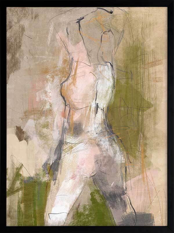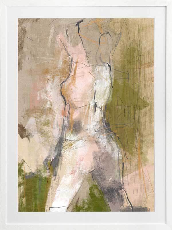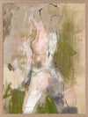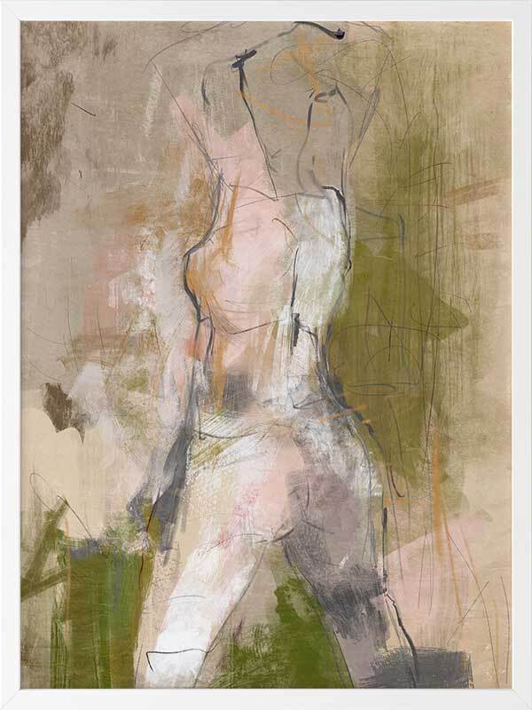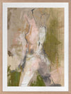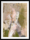 Unafraid Framed Art Print - Earthy and warm, this raw, organic and expressive artwork piece features a rough line sketch of a nude female figure against a richly textured khaki green and neutral beige background. Soft peach and cream-toned accents and quick, frantic strokes create stunning visual contrast.