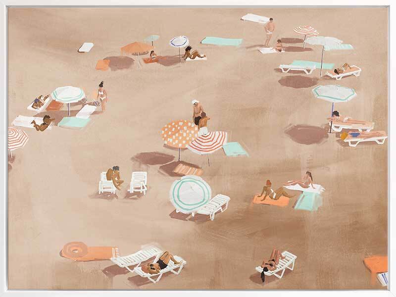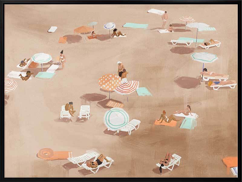 Under The Sun Cool Brown Canvas Art Print - A reminder of summer days, relaxing with loved ones under the heat of the sun, not a plan in mind, this artwork is a unique way to bring coastal vibes into your space. Palette includes cool brown tones with pops of turquoise blue, orange, and white.