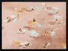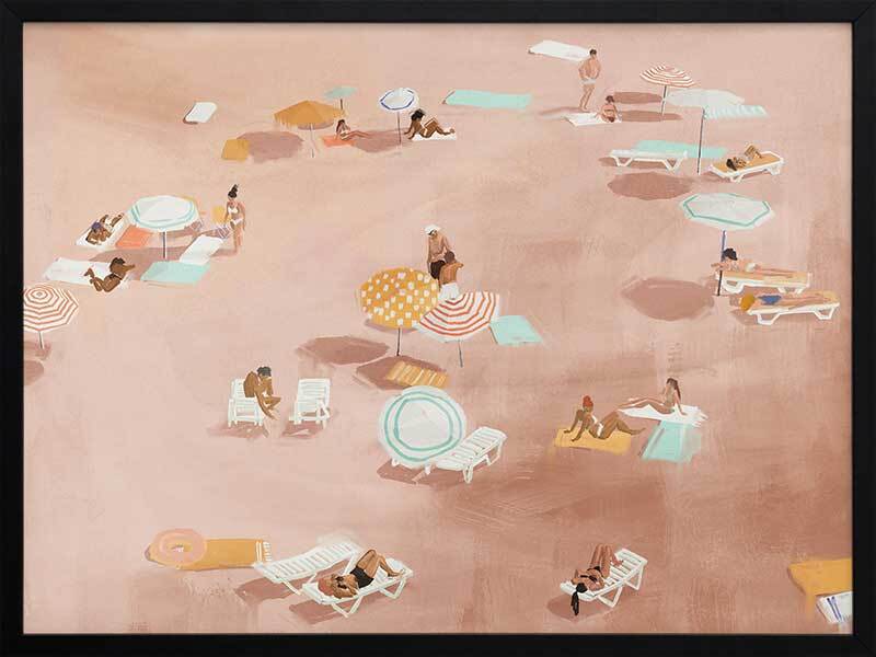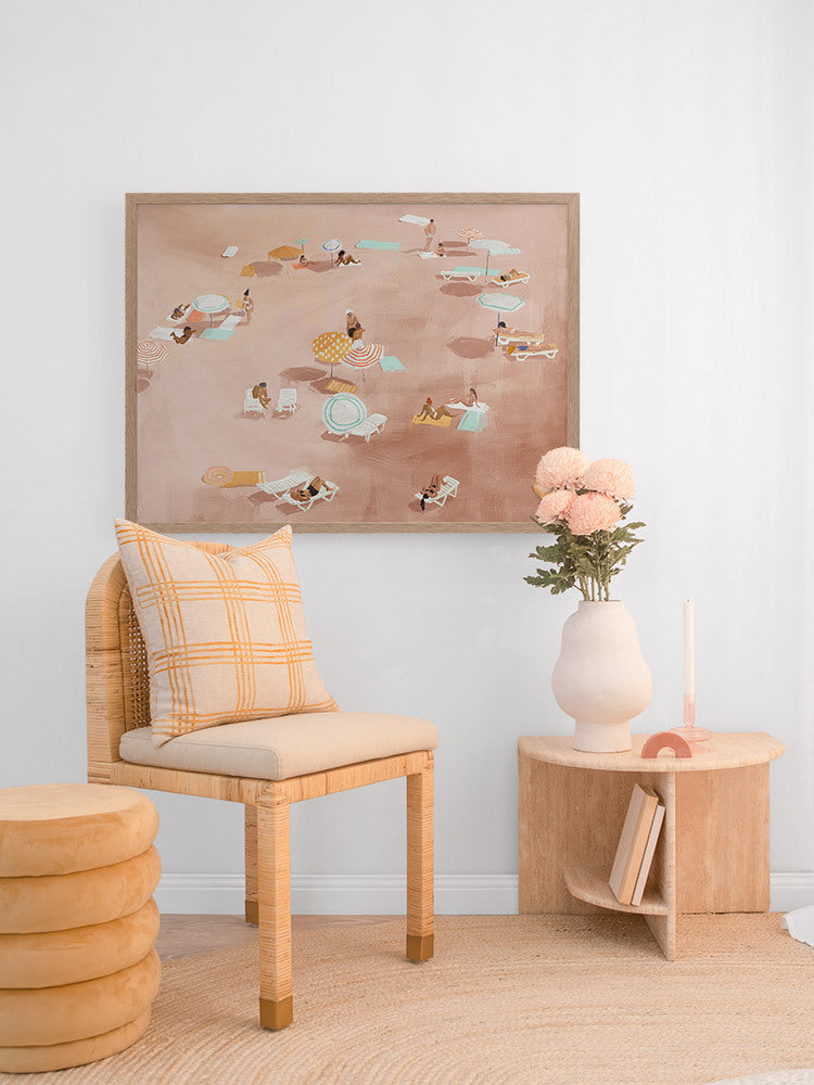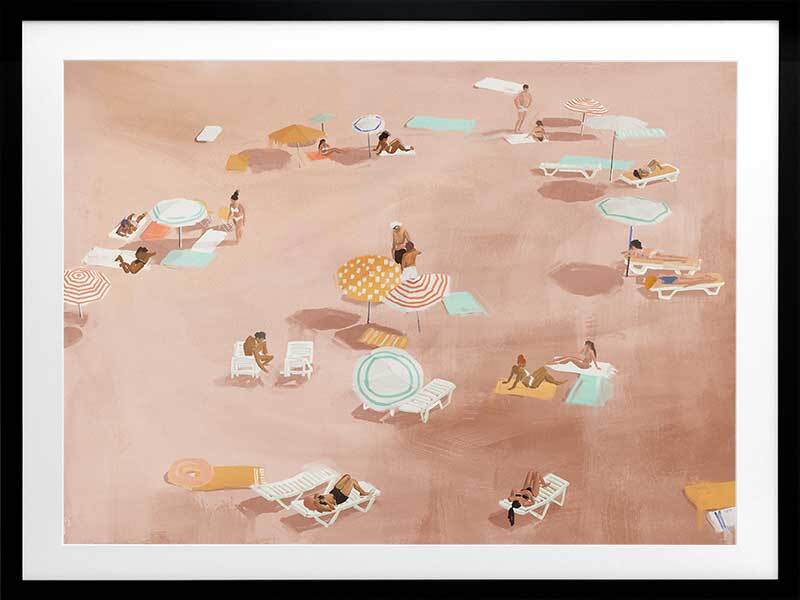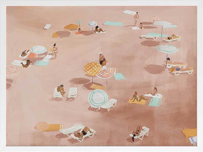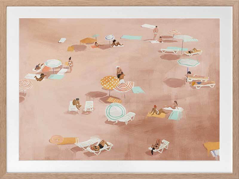 Under The Sun Warm Brown Framed Art Print - A reminder of summer days, relaxing with loved ones under the heat of the sun, not a plan in mind, this artwork is a unique way to bring coastal vibes into your space. Palette includes warm brown tones with pops of turquoise blue, orange, and white.