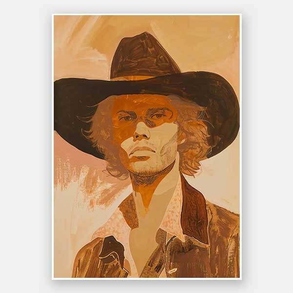 Untamed Cowboy Unframed Art Print - Windswept on the Western range, this cowboy is the epitome of the American country aesthetic, wearing a rugged brown cowboy hat. Perfect for adding a calm moodiness to your space, this artwork uses a loose, painterly style with a palette of sun-bleached ochre, shades of sienna, and deep browns to create a rugged look.