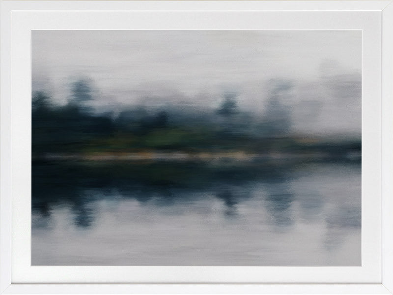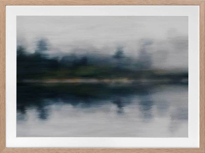 Upon Reflection Framed Print: A blurred landscape artwork featuring a grey sky and a dark, green and teal tree line reflected in a lake. 2019 AUTUMN/WINTER COLLECTION: ODYSSEY