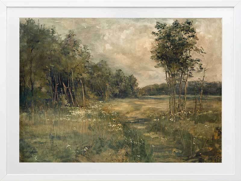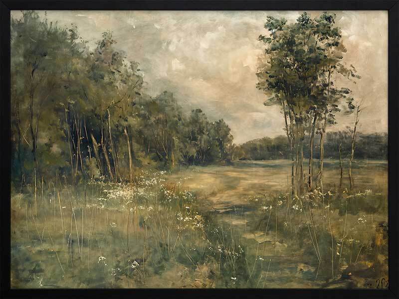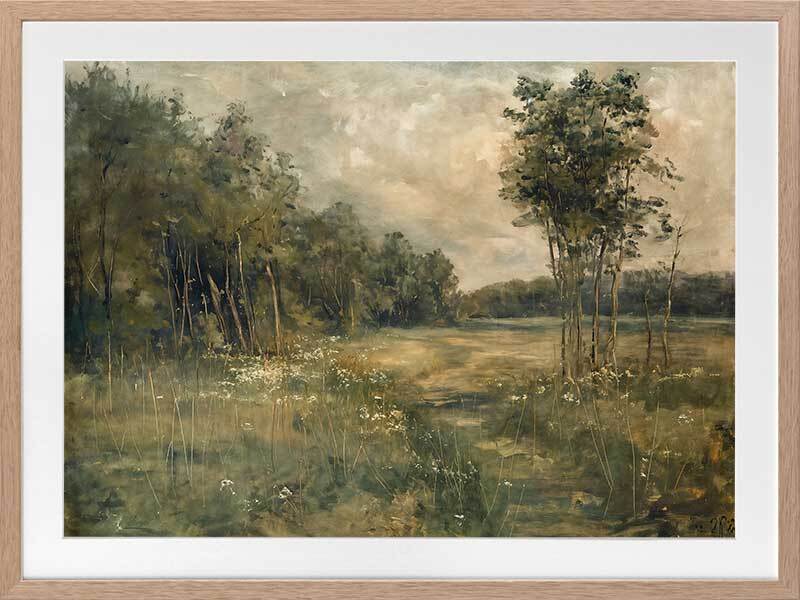 Wildflower Daydreams Framed Art Print - This artwork by Darren Palmer captures a serene landscape, where gentle greens and warm earth tones blend to create a tranquil scene. The delicate brushstrokes and layered textures evoke a sense of calm and connection to nature, making it a perfect addition to any interior design style. This art print, rich in detail and atmosphere, will enhance your home decor with its peaceful beauty, bringing a touch of the idyllic countryside into any living room or bedroom.