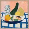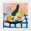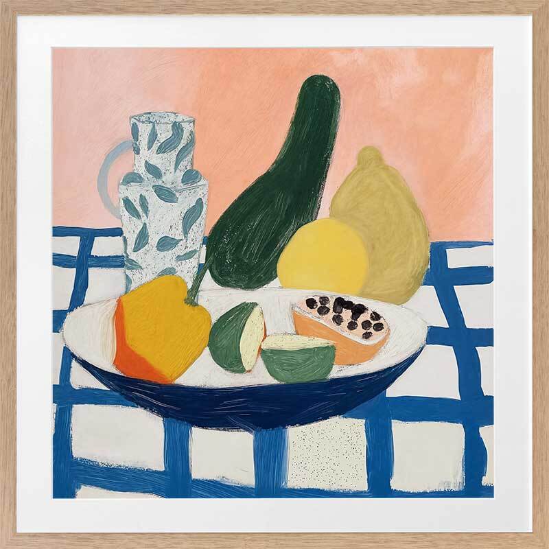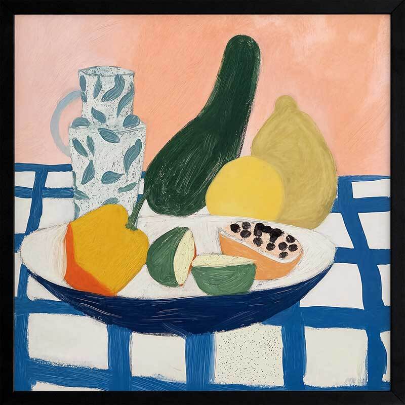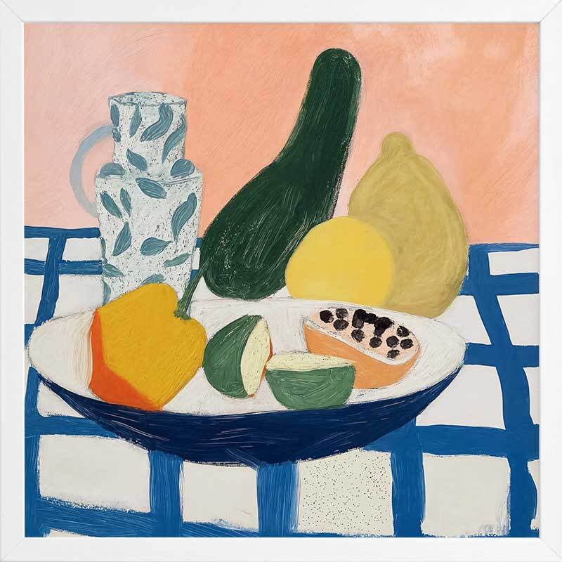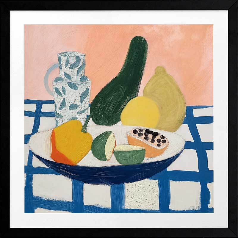 Vamos Framed Art Print - Vamos to the table, because fresh fruit is served! This playful still life artwork, perfect for kitchen wall art, features a spread of mango, lime, and papaya in the bowl, with fresh lemons, a large cucumber, and a water jug in the background, all on a checkered tablecloth. Palette includes blue, green, yellow, and soft pink shades.