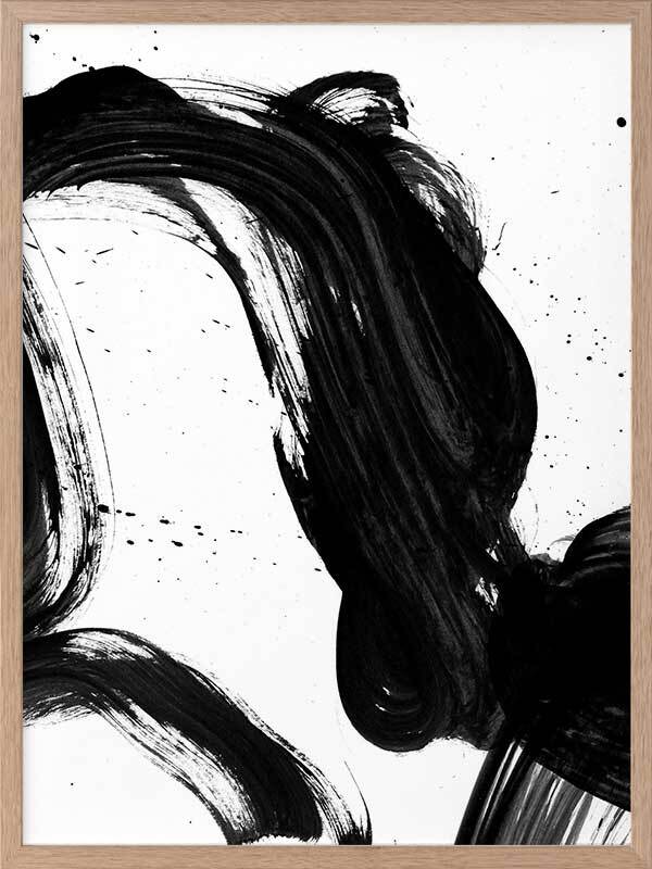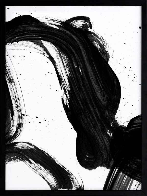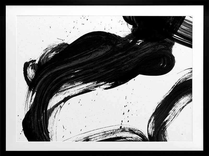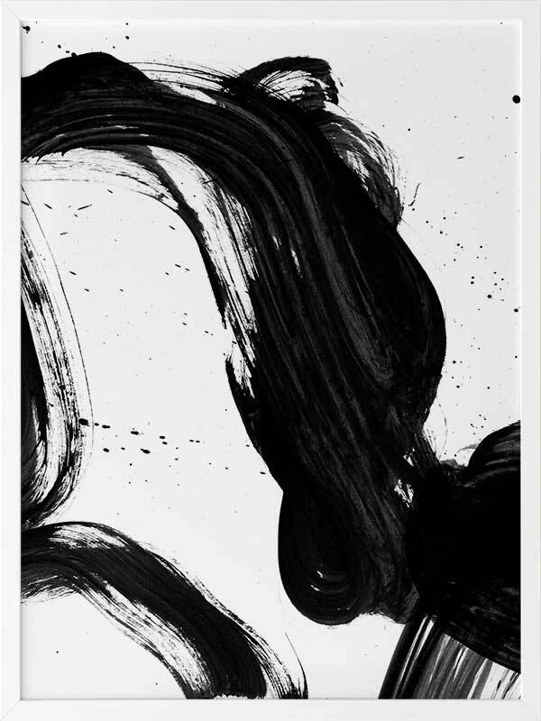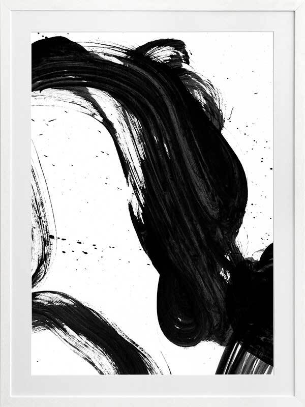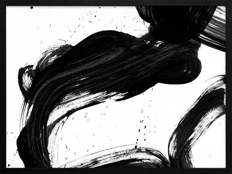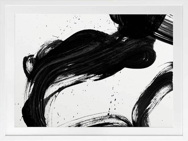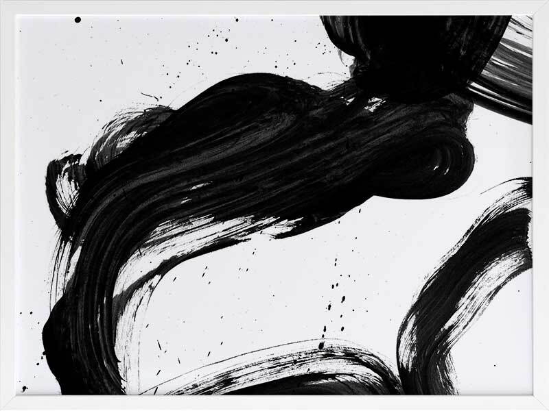Velodrome I Framed Print: A minimalist art print featuring a bold, black paint stroke across a stark white background. Pairs with Velodrome II and III. 2020 AUTUMN/WINTER COLLECTION: REVERIE