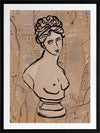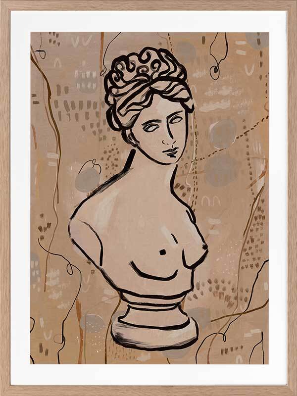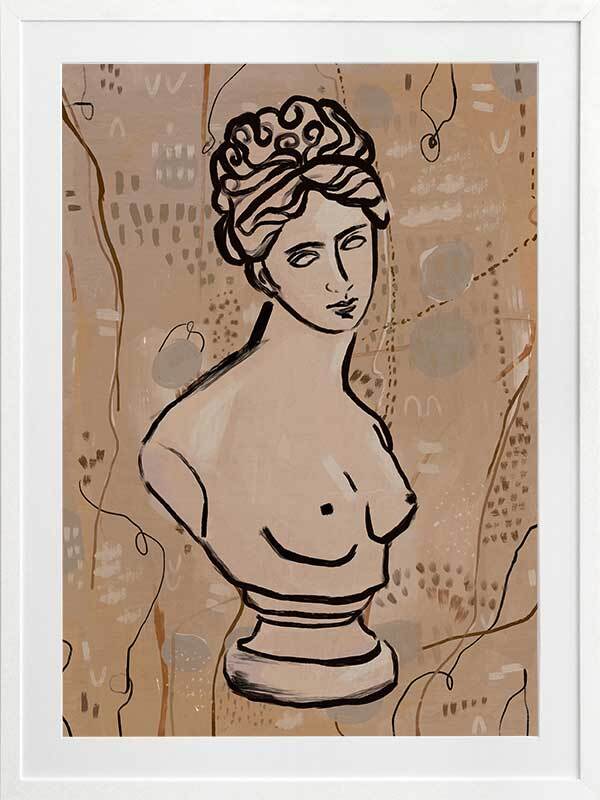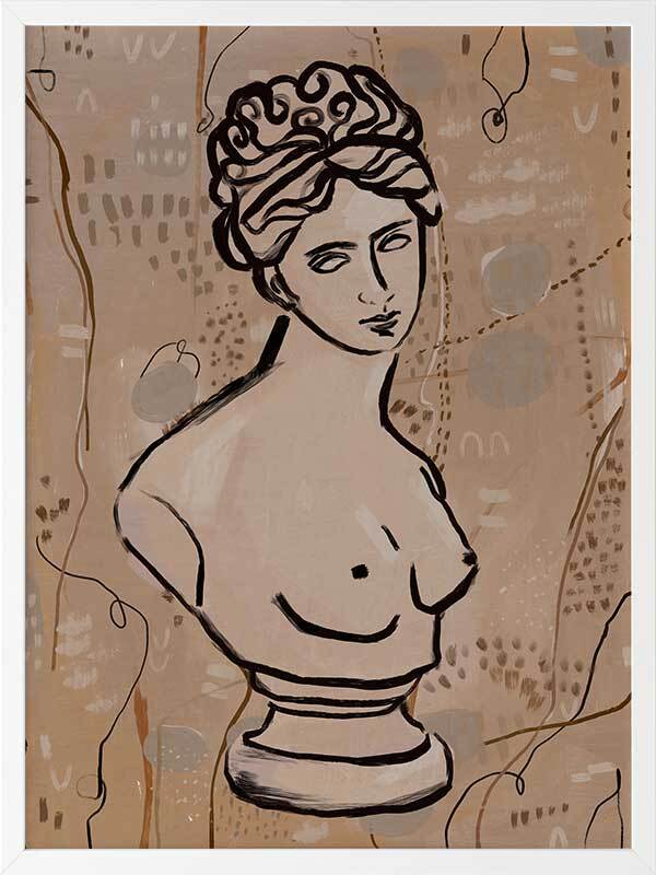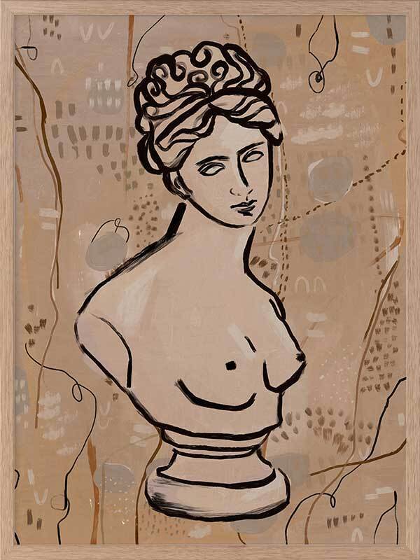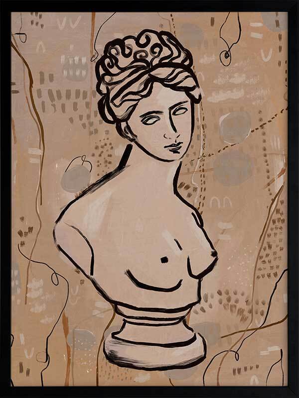 Venus Framed Art Print - History lovers will be drawn to this bold depiction of ancient feminine beauty. This illustrative artwork features a black line painting of a greek-style bust, against a neutral, brown textured and patterned background.