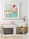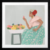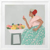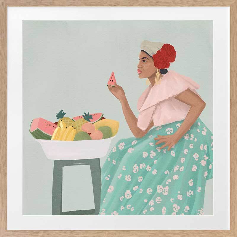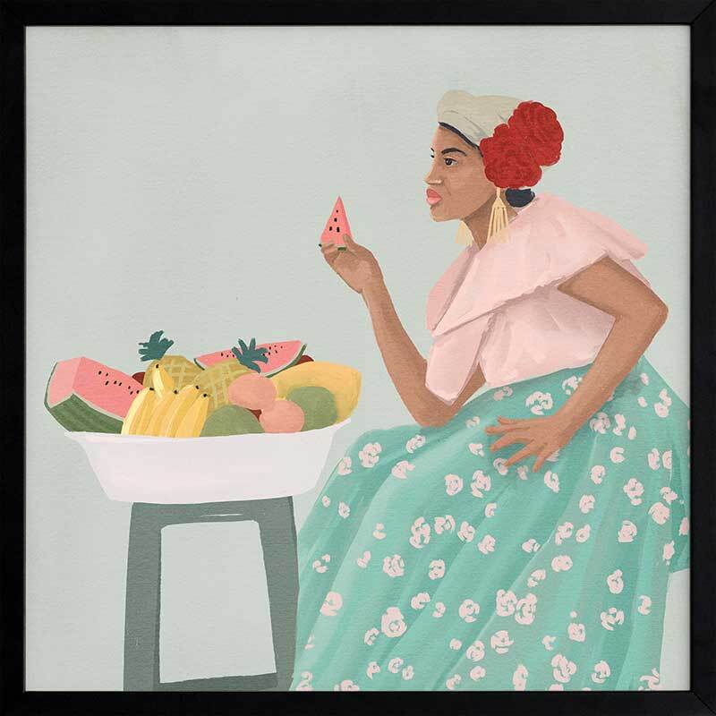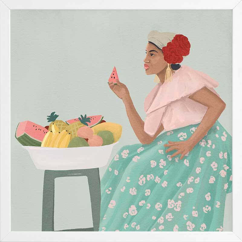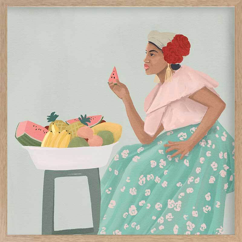 Vida dulce Framed Art Print - A moment capturing a quick break from her busy fruit stall, this piece brings all the colour and charisma to love about Latin culture. Beside a bursting bowl of sweet summer fruit, she sits idly enjoying a juicy slice of watermelon, dressed in a gorgeous bright minty green skirt and light pink top, crimson red flowers adorning her hair. Against a soft mint background, bright yellow, green and pink colours pop to bring a fun, charming energy to your space.