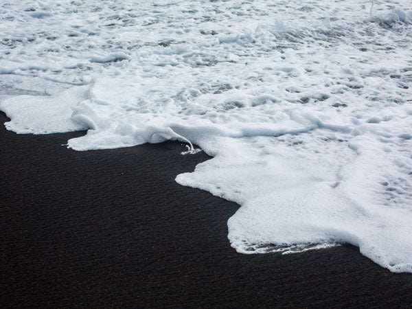 Vik - A distinct photographic image of rich sea foam leaving the black sand on the beach shore.