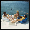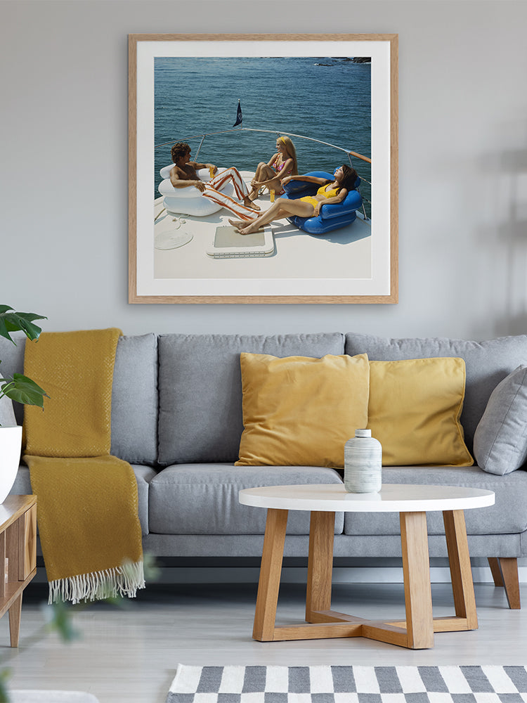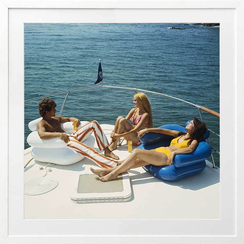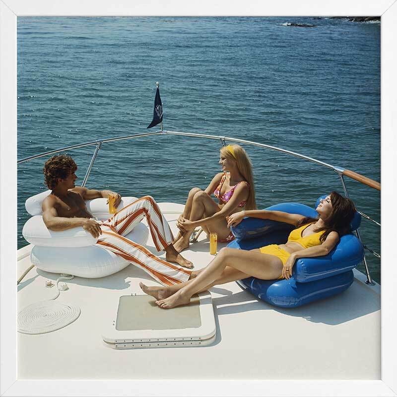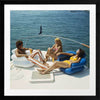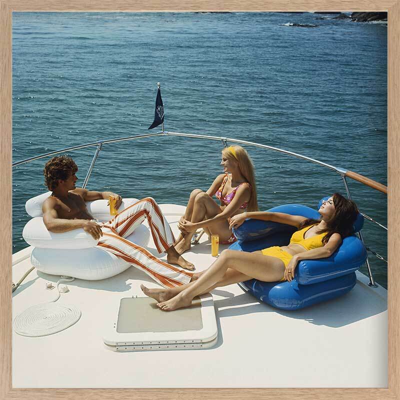Vintage Boat Cruise Framed Art Print - Give a nod to the 70's with this uber chic vintage photograph featuring a man and two women relaxing on a private boat with the calming water behind them. The colour palette for this artwork is multicoloured with the main colours being blue from the ocean, as well as yellow and orange tones from the vintage clothing.