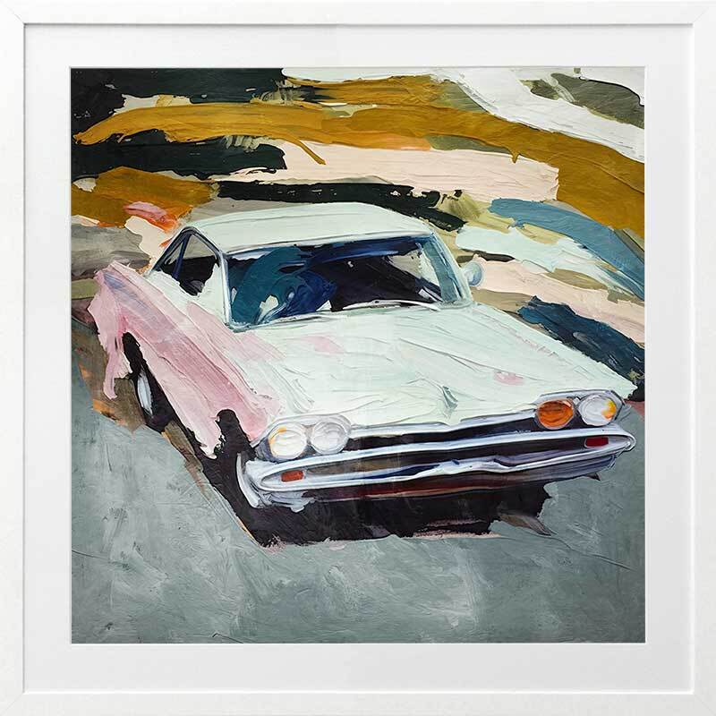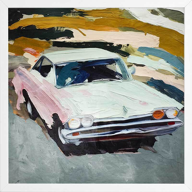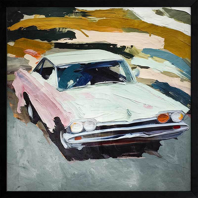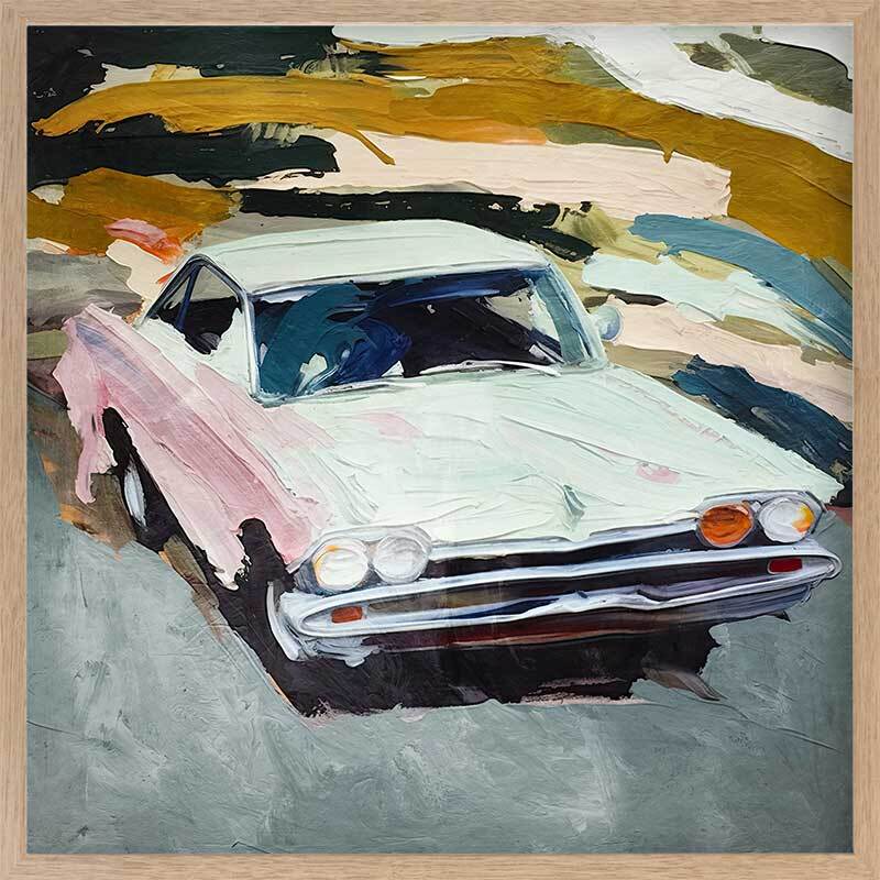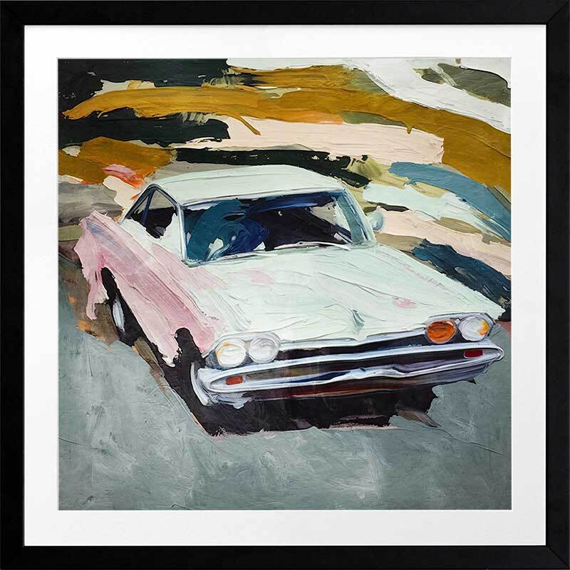Vintage Car II Framed Art Print - This abstract-inspired retro car art piece celebrates the beauty in vintage vehicles, with a sophisticated edge. Featuring visible brush strokes that create a heavily textured look, this modern art print instantly sparks character and interest in your space, with pops of pink, red, and yellow against soft white and grey tones. Pair with Vintage Car I.