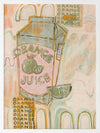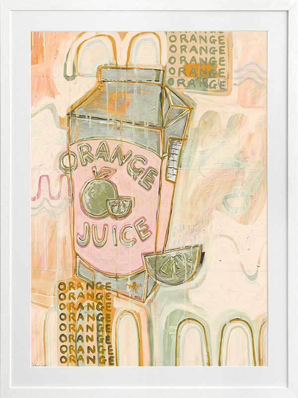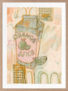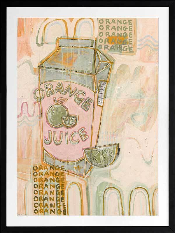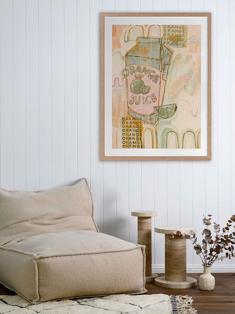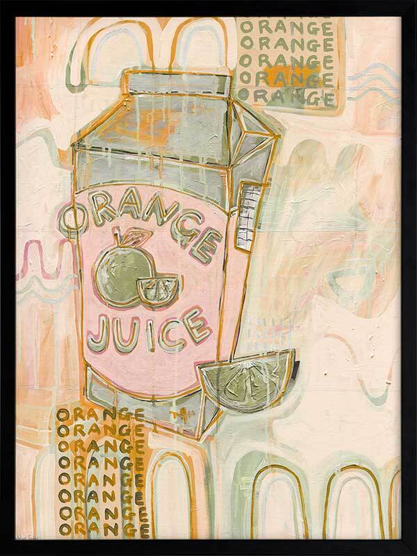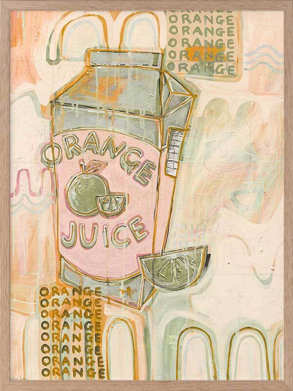 Vitamin C You Later Muted Green Framed Art Print - Bring a lively energy to your space with this unique, abstract piece portraying a cold carton of orange juice and freshly sliced wedge, flooded by a strip of flickering neon lights coming from outside the window. A monotone colour palette of muted green, pink and orange makes this the perfect piece to animate your space. Add it to your existing colours, or incorporate it among neutral tones for that exciting pop of colour.