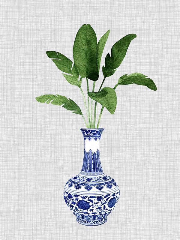Wainscot - A Hampton's inspired artwork featuring a watercolour painted plant in a chinoiserie vase on a textured grey background.