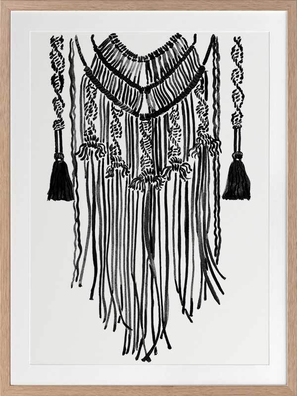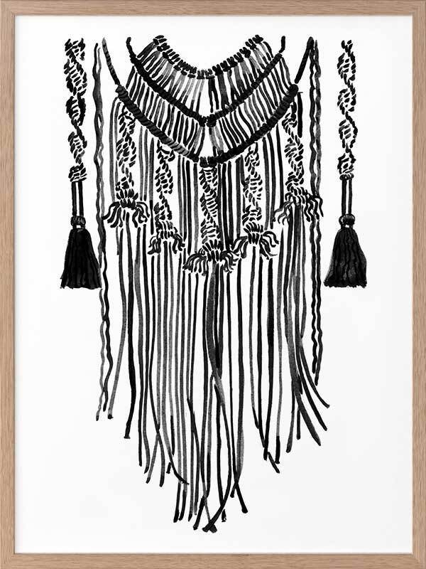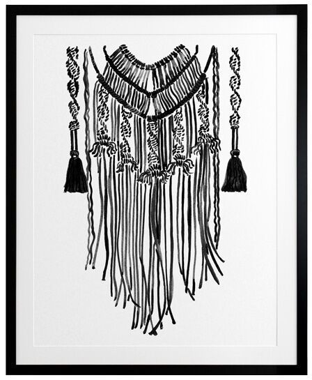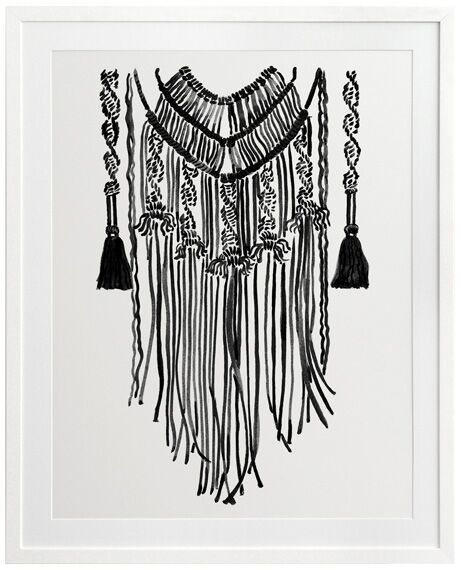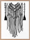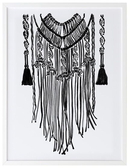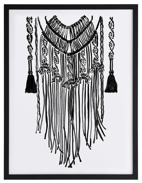 Wanderer Charcoal Framed Print: A wonderfully detailed watercolour illustration of a bohemian macrame wall hanging in black and white. 2017 SPRING/SUMMER COLLECTION: RHAPSODY