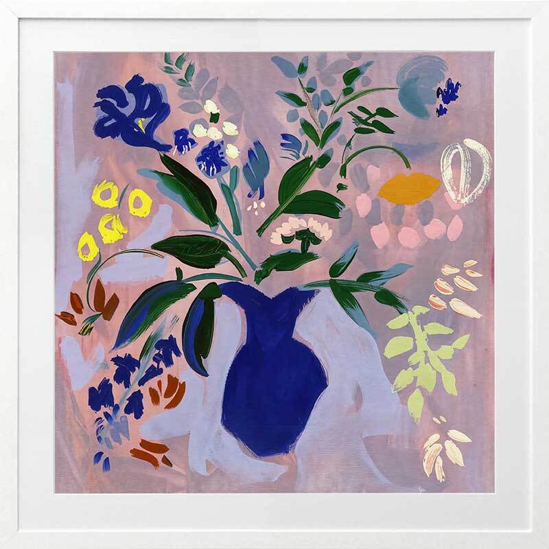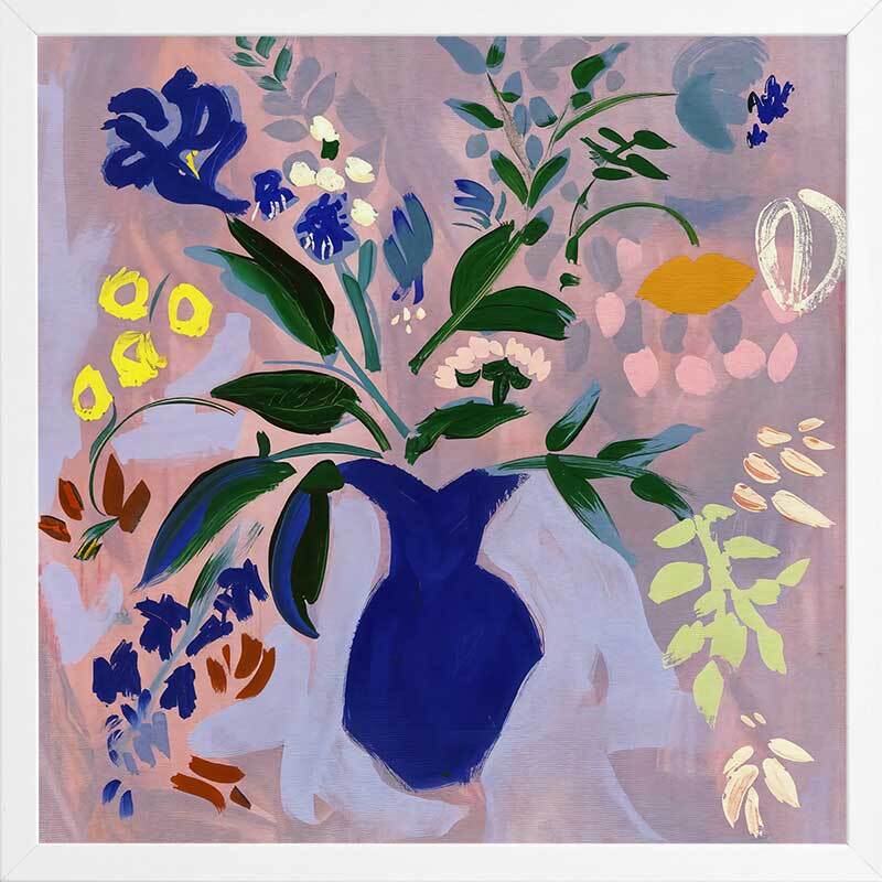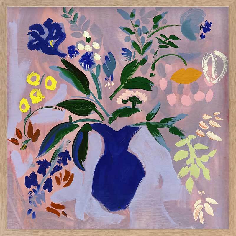Wanderlust I Framed Art Print - In this flower painting, a vivid bouquet bursts with life. Featuring bold blues, greens, yellows, and soft pinks, this floral and botanical painting exudes a fresh, modern charm. The dynamic arrangement brings a sophisticated touch to any room, making it a perfect statement for contemporary decor.
