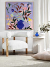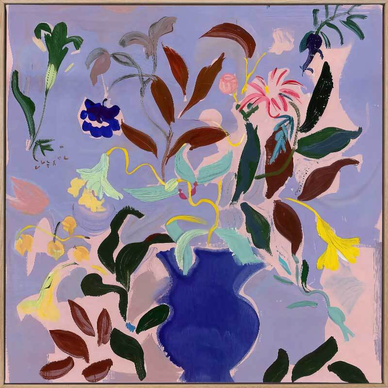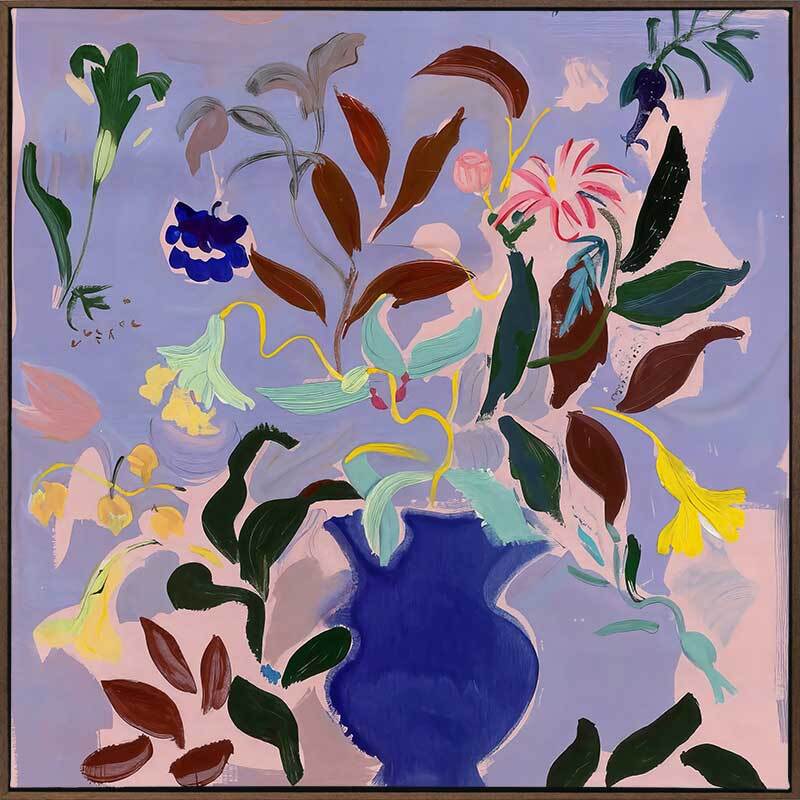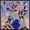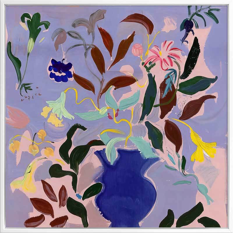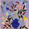 Wanderlust II Canvas Art Print - A vibrant bouquet bursts from a rich blue vase in this dynamic flower painting. Bold strokes of yellow, green, and deep brown leaves contrast against a soft lavender background, creating a lively yet balanced piece. Perfect for adding a splash of colour and energy to any room.