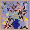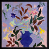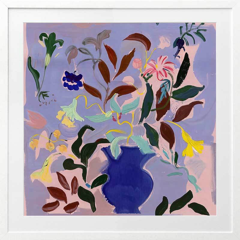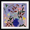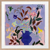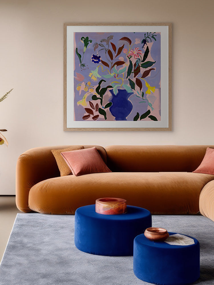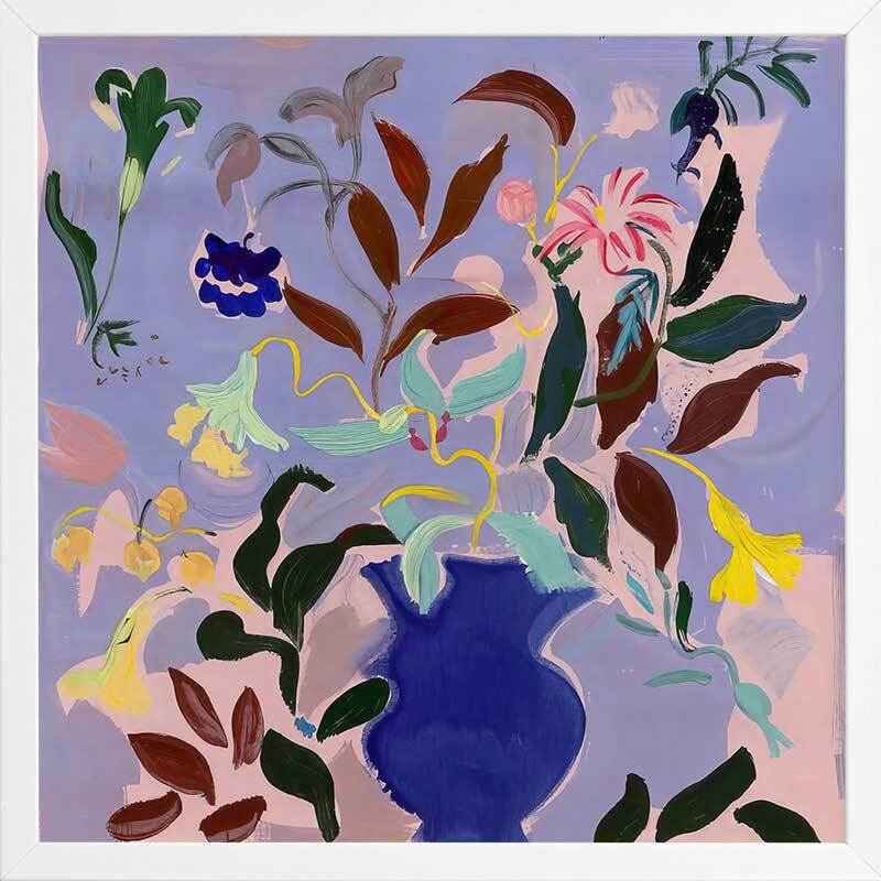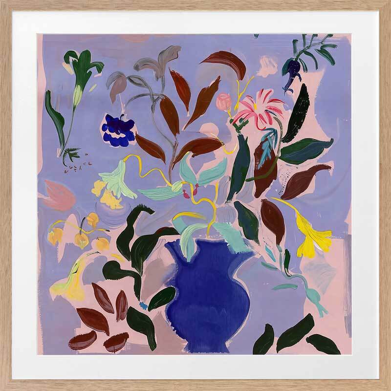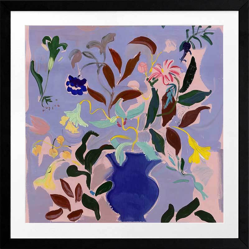 Wanderlust II Framed Art Print - A vibrant bouquet bursts from a rich blue vase in this dynamic flower painting. Bold strokes of yellow, green, and deep brown leaves contrast against a soft lavender background, creating a lively yet balanced piece. Perfect for adding a splash of colour and energy to any room.