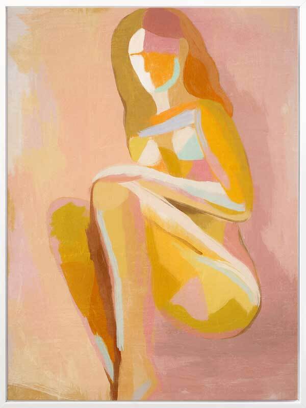 Warmth Canvas Art Print - Radiant and warm, this artwork features an array of brightly coloured geometric shapes joined together to create the form of a woman's body. The colour palette features rich mustards, soft peach and warm blush tones.