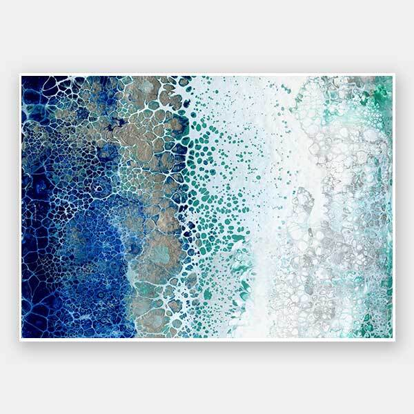 Wash Away I Unframed Art Print - Where sand and ocean collide, hearts are swept away, and sands are left bare. A beautiful abstract study of seafoam bubbling on the sand, with captivating jewel-toned blue and turquoise, white, and sandy beige, perfect for a coastal themed home or to breathe life into any space.
