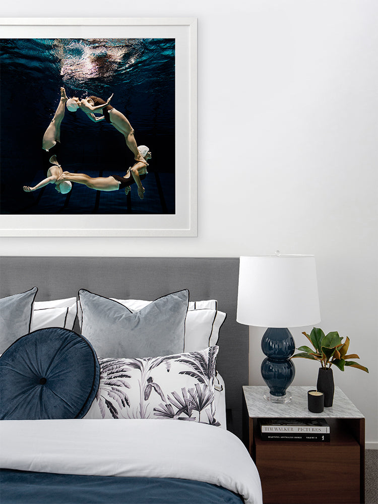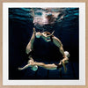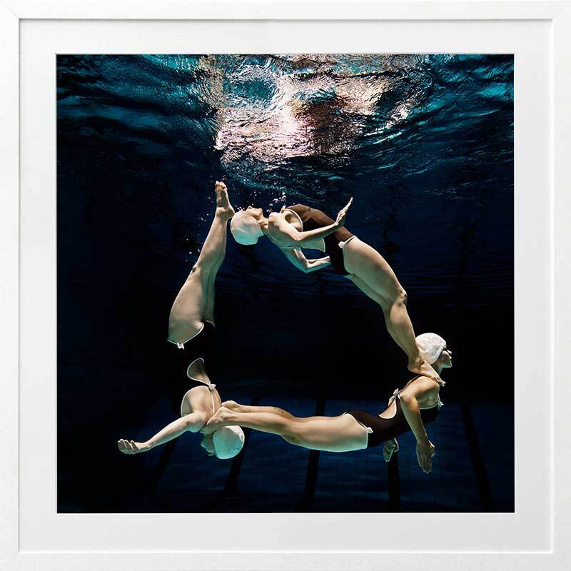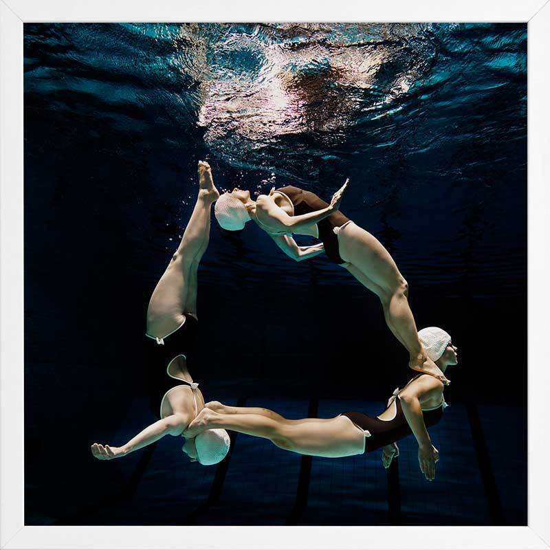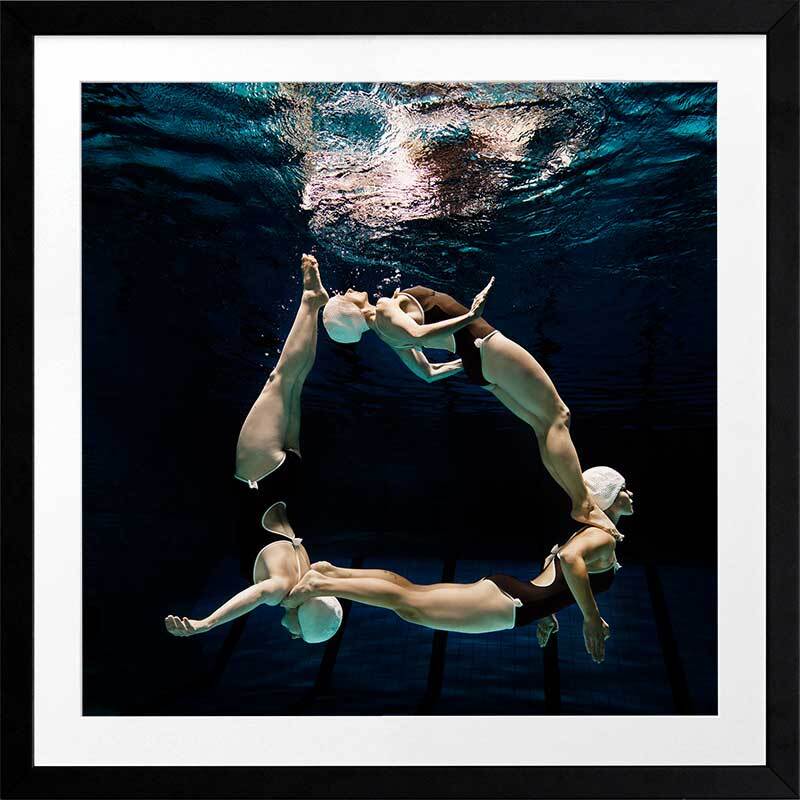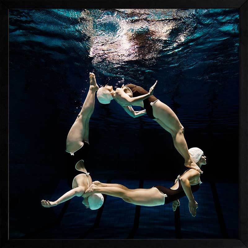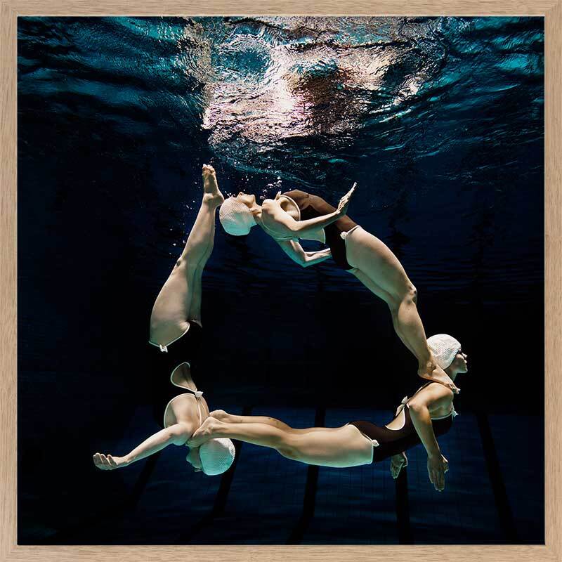 Water Aerobics II Framed Art Print - Water aerobics is both aesthetically pleasing to watch and beautiful to capture. This photographic artwork features three synchronised swimmers forming a circle with each other. The colour palette features dark moody colours of blue and black from the water. Pairs well with Water Aerobics I.