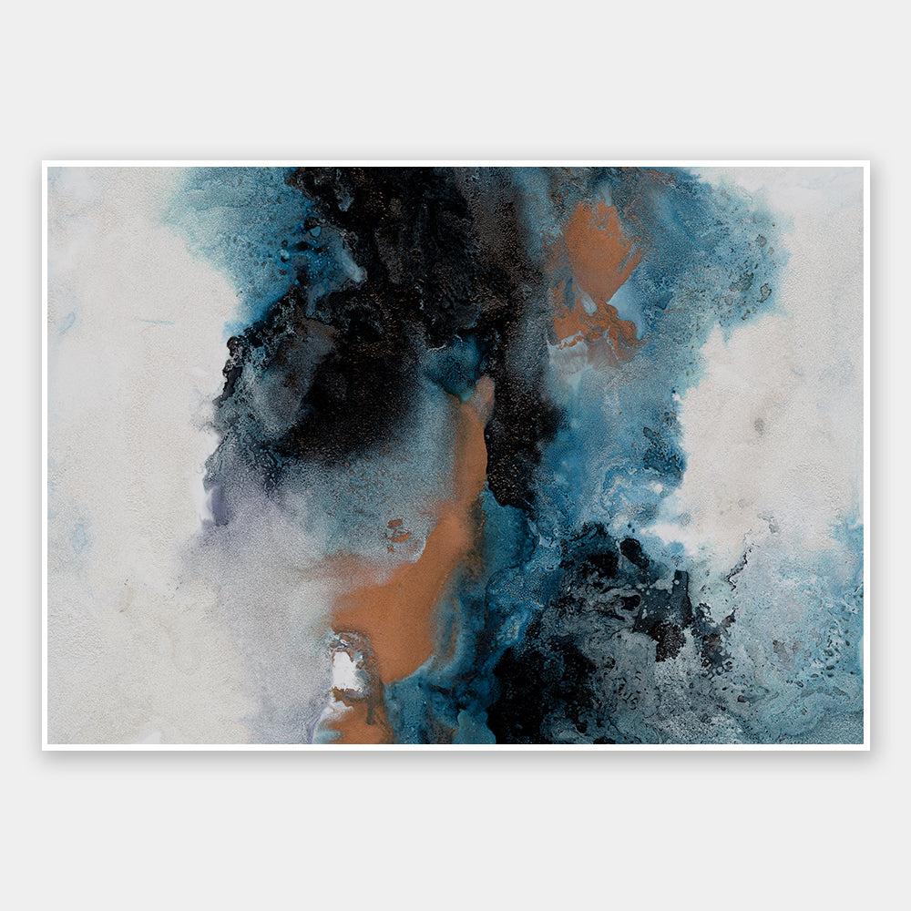 Water and Earth I Unframed Art Print - A wonderfully turbulent design that inspires thoughts of crashing waves. The artwork features layers of rich, deep blue tones blended with black and grey and accented with pops of copper. Pairs with Water and Earth II.