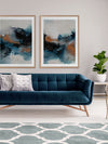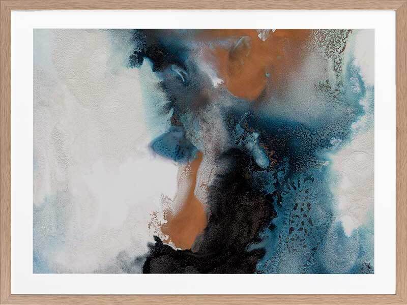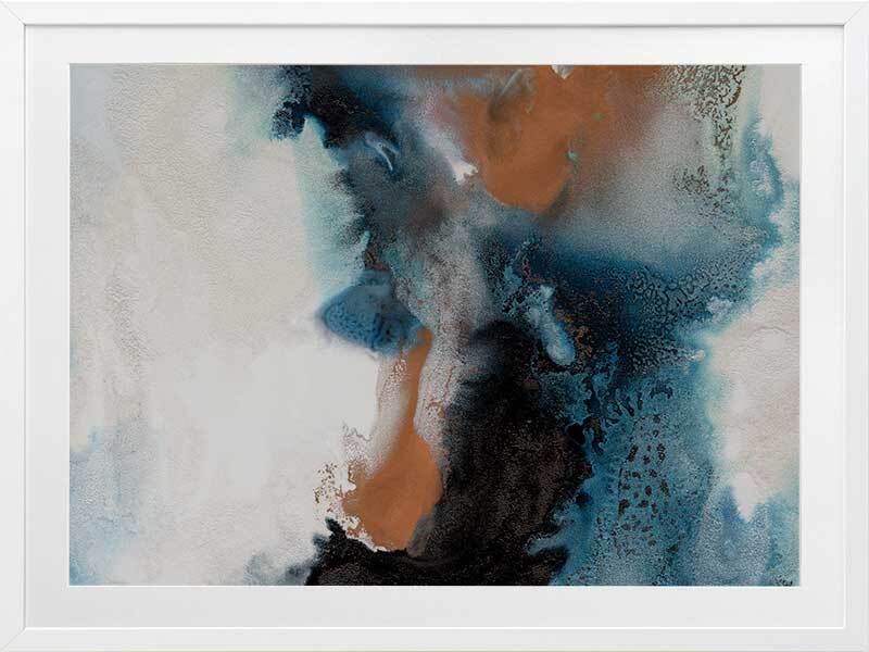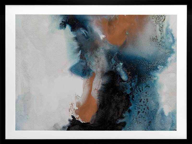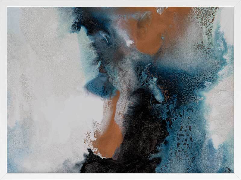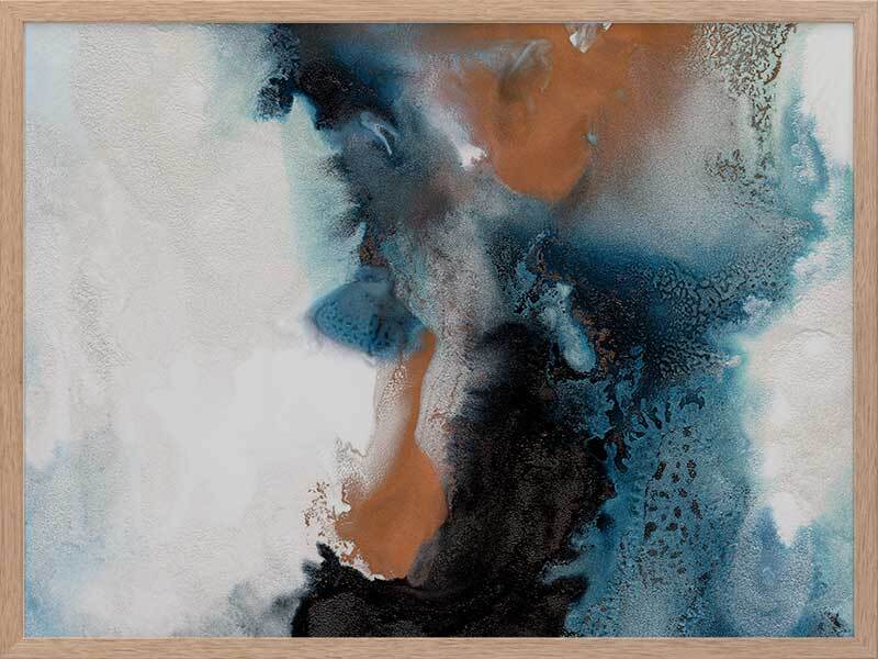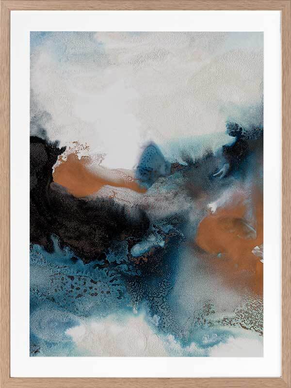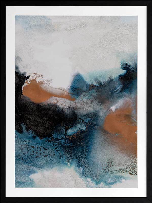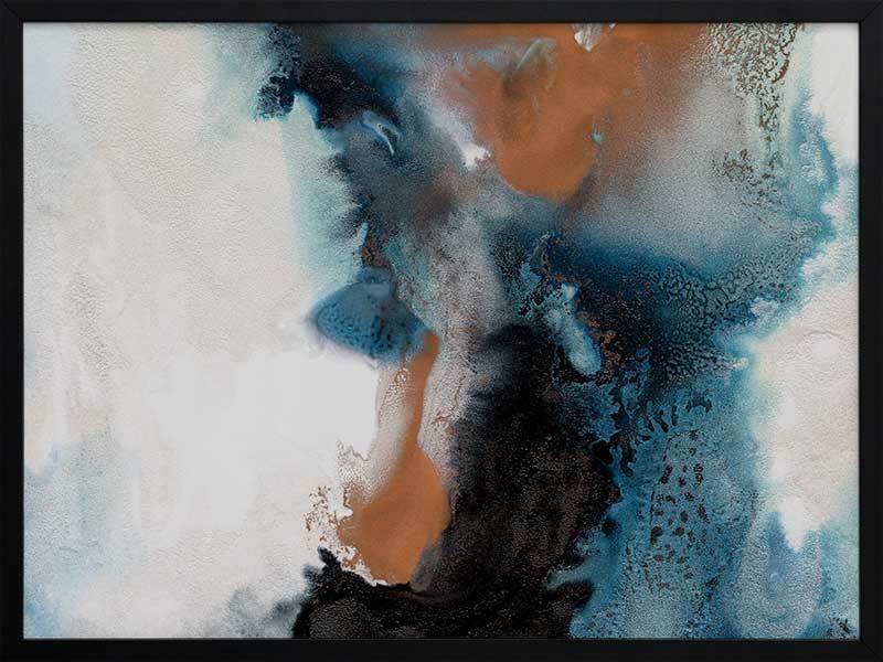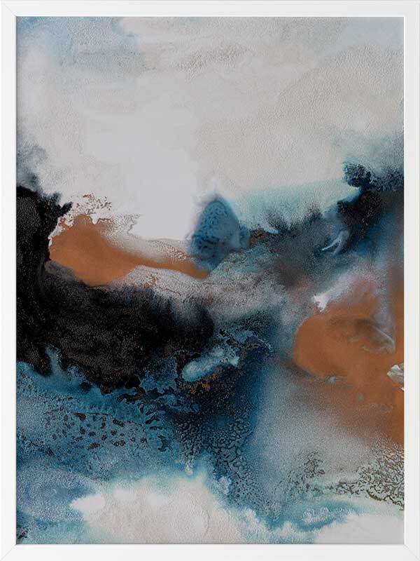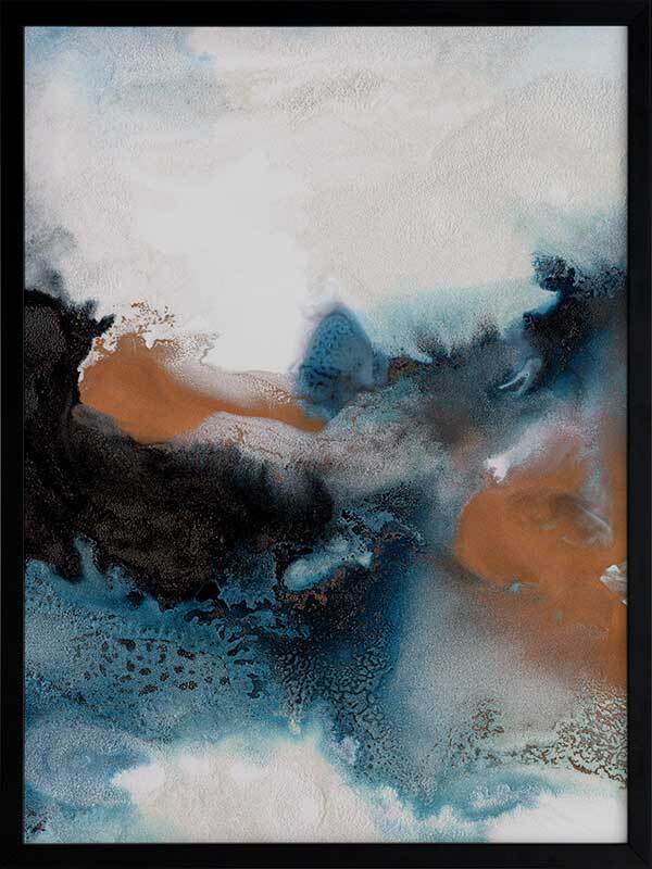 Water and Earth II Framed Art Print - A wonderfully turbulent design that inspires thoughts of crashing waves. The artwork features layers of rich, deep blue tones blended with black and grey and accented with pops of copper. Pairs with Water and Earth I.
